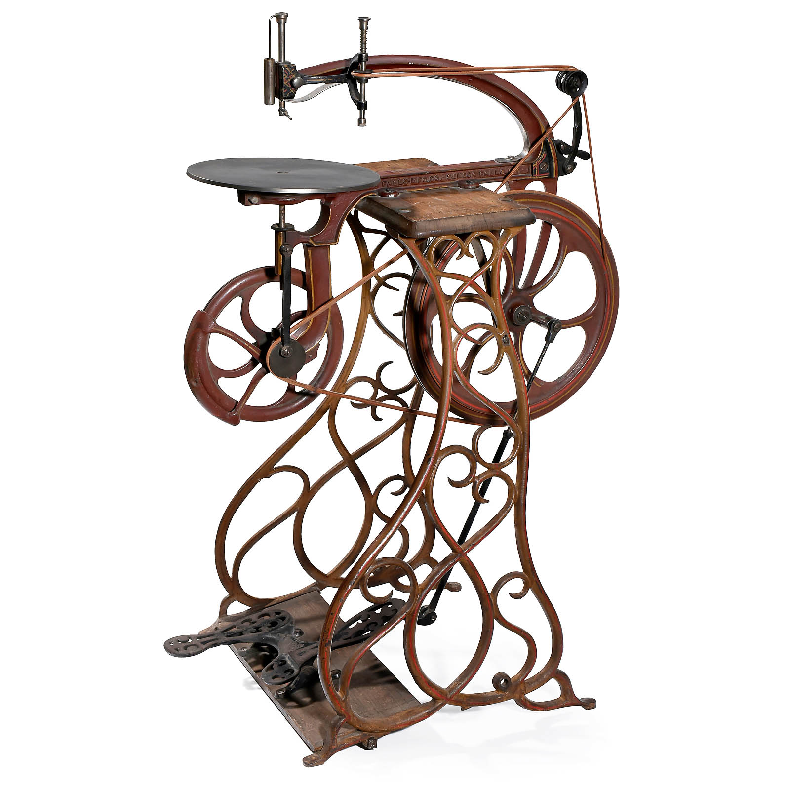 By "Seneca Falls Mfg. Co.", patented 1877, paint-decorated cast-iron frame, treadle-operated, with drill.