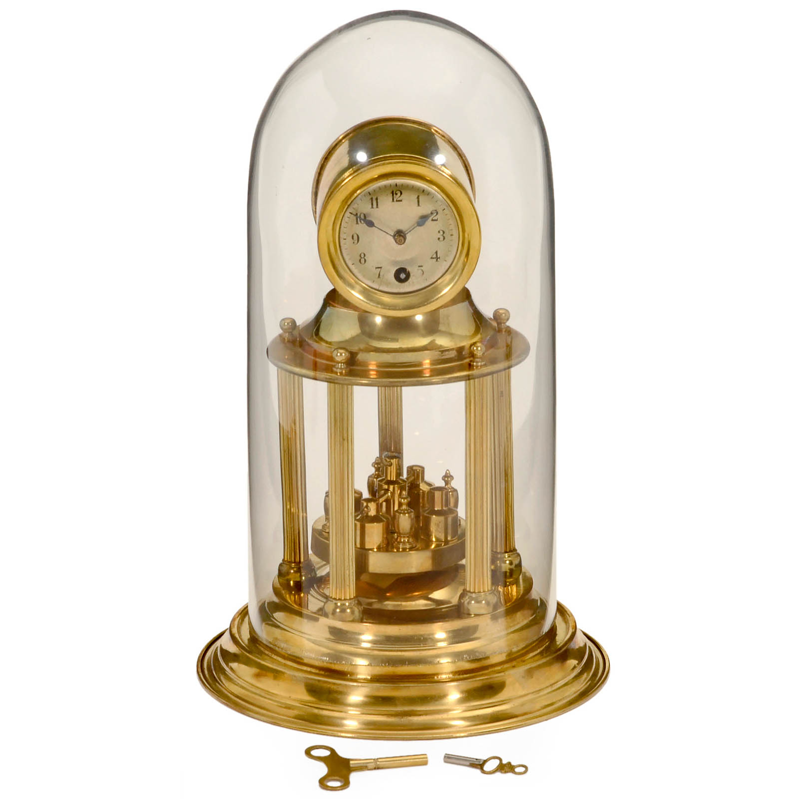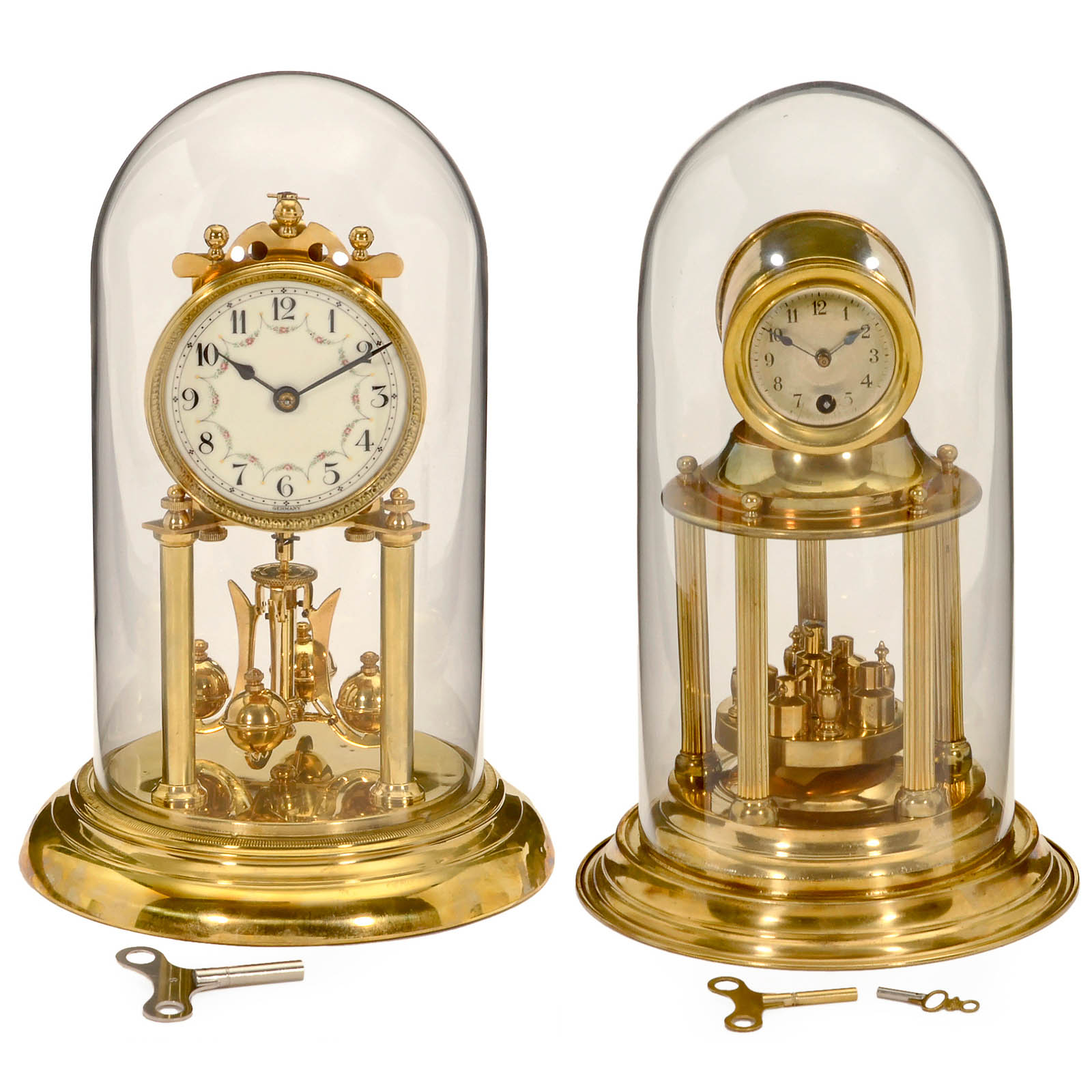 1) Anniversary clock, probably by Vossler, brass, five-post domed, with 2 keys, height 10 ½ in., under glass dome, working. – And: 2) Unmarked, ornated enamel dial, two-post domed, height 11 ¾ in., working.
