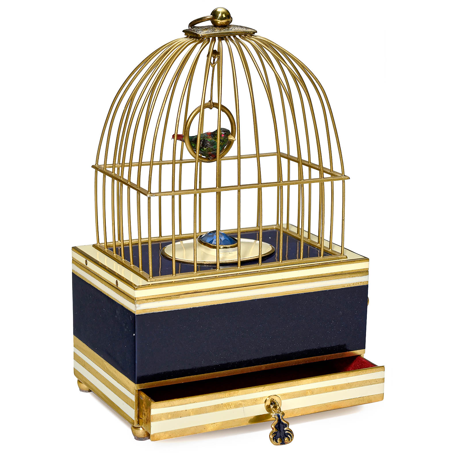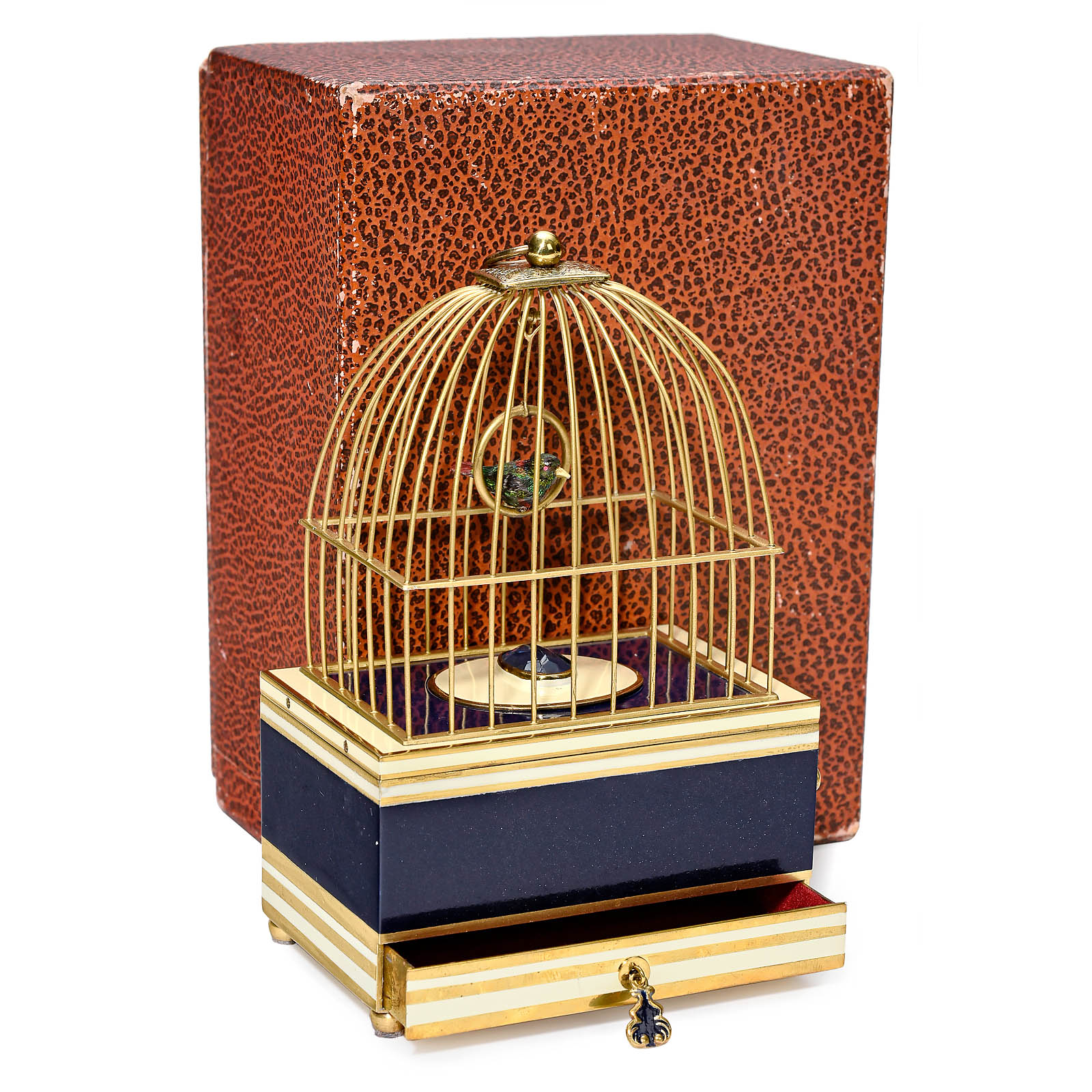 Triberg, Black Forest, Germany. Model K 1053/3, with going-barrel movement, bird with iridescent plumage, moving metal beak, wings, perch and tail, a second (static) bird swinging on perch in domed brass cage; on brass, blue and cream enameled base with drawer for the key, height 6 in. (15,5 cm), no key, in original card box. A rare and stylish singing bird box, in good working condition.