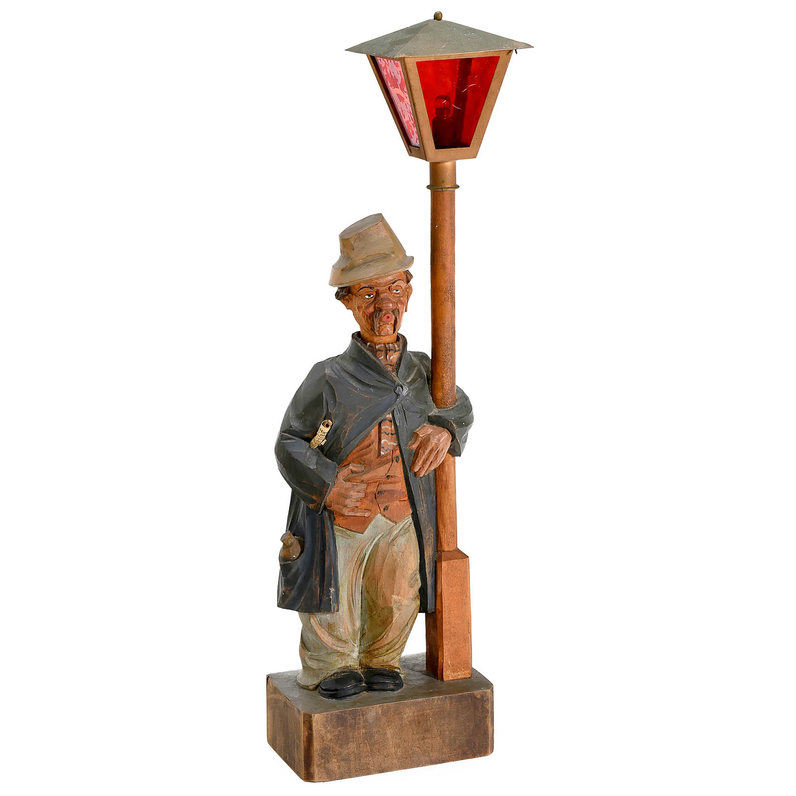 Triberg, carved and painted limewood figure leaning against battery-operated lamp post, with articulated head, rolled newspaper under his arm, going-barrel movement, bellows and whistle for the song "Lili Marleen", height 18 ½ in. (47 cm). Good working condition, no key, lamp not tested.