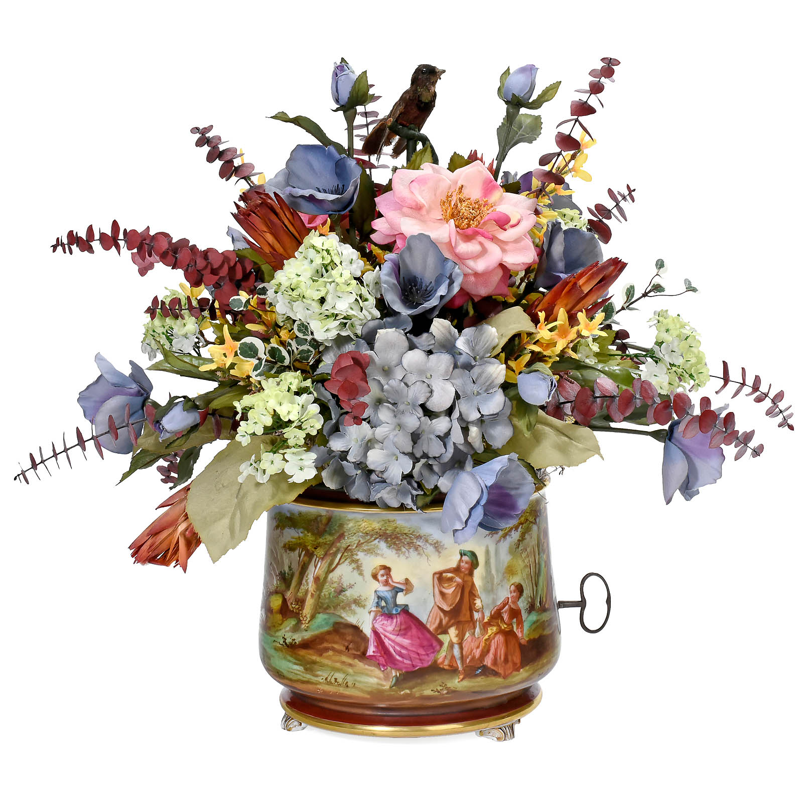 Bird with brown plumage, articulated head, beak and tail controlled by going-barrel movement with bellows and whistle for birdsong, in porcelain jardinière decorated with painted scene of romantic couple discovered in sylvan landscape by a rival who covers her eyes. With lower gilt rim and shell feet, height 19 ½ in. (49 cm) x approx. 9 in. (23 cm) diameter, with key, chips on keyhole and one foot, unobtrusive hairline crack (on reverse) and underside. – Literature: Bailly, "Automata, the Golden Age", p. 48. – A luxurious exhibition piece by Bontems in excellent working condition.