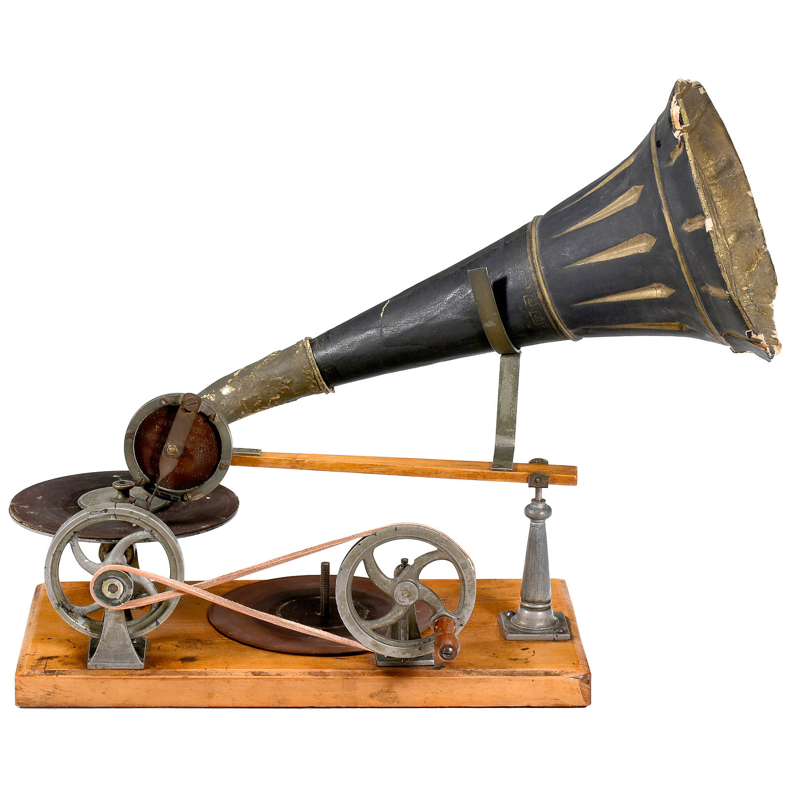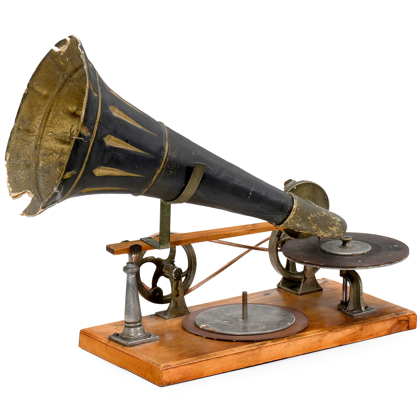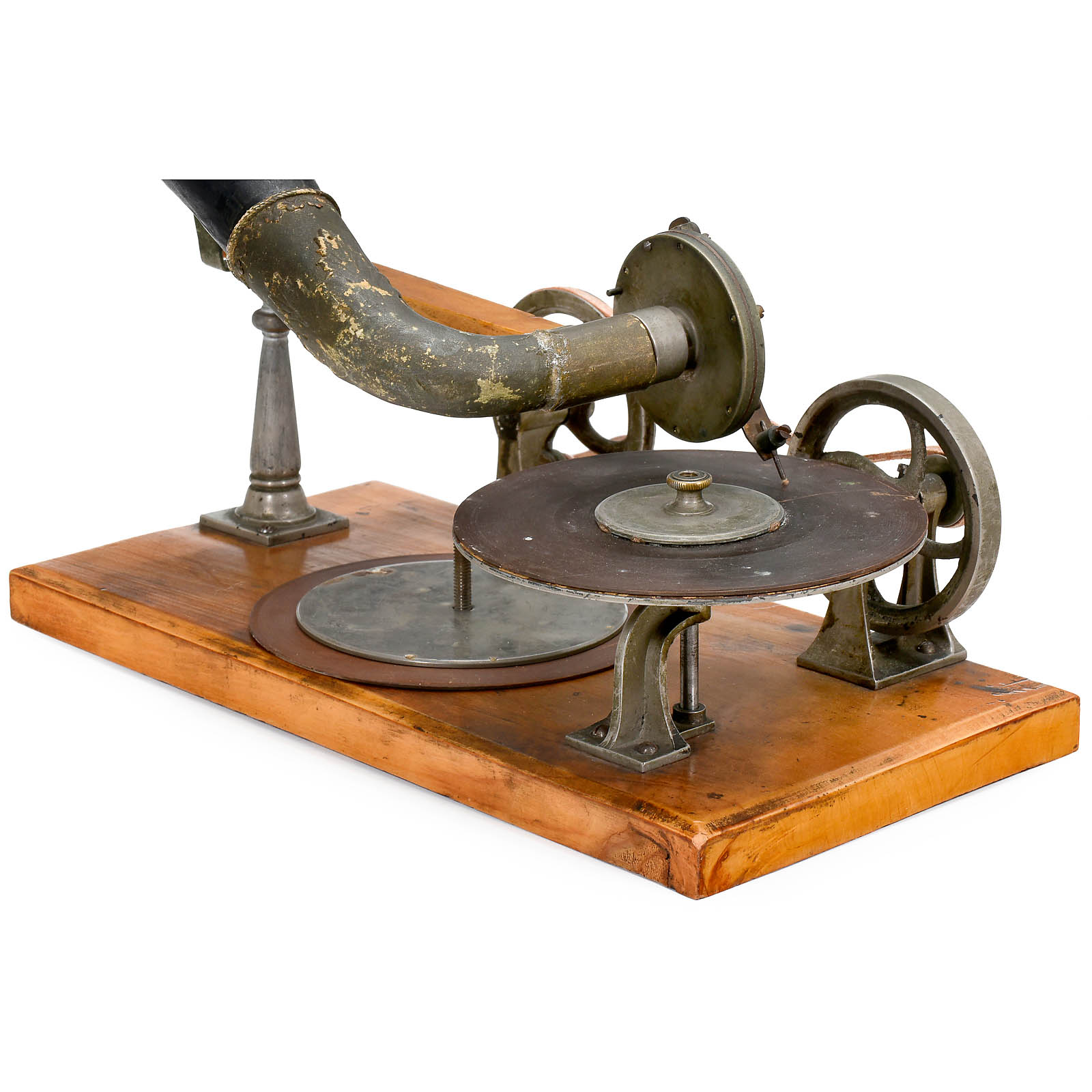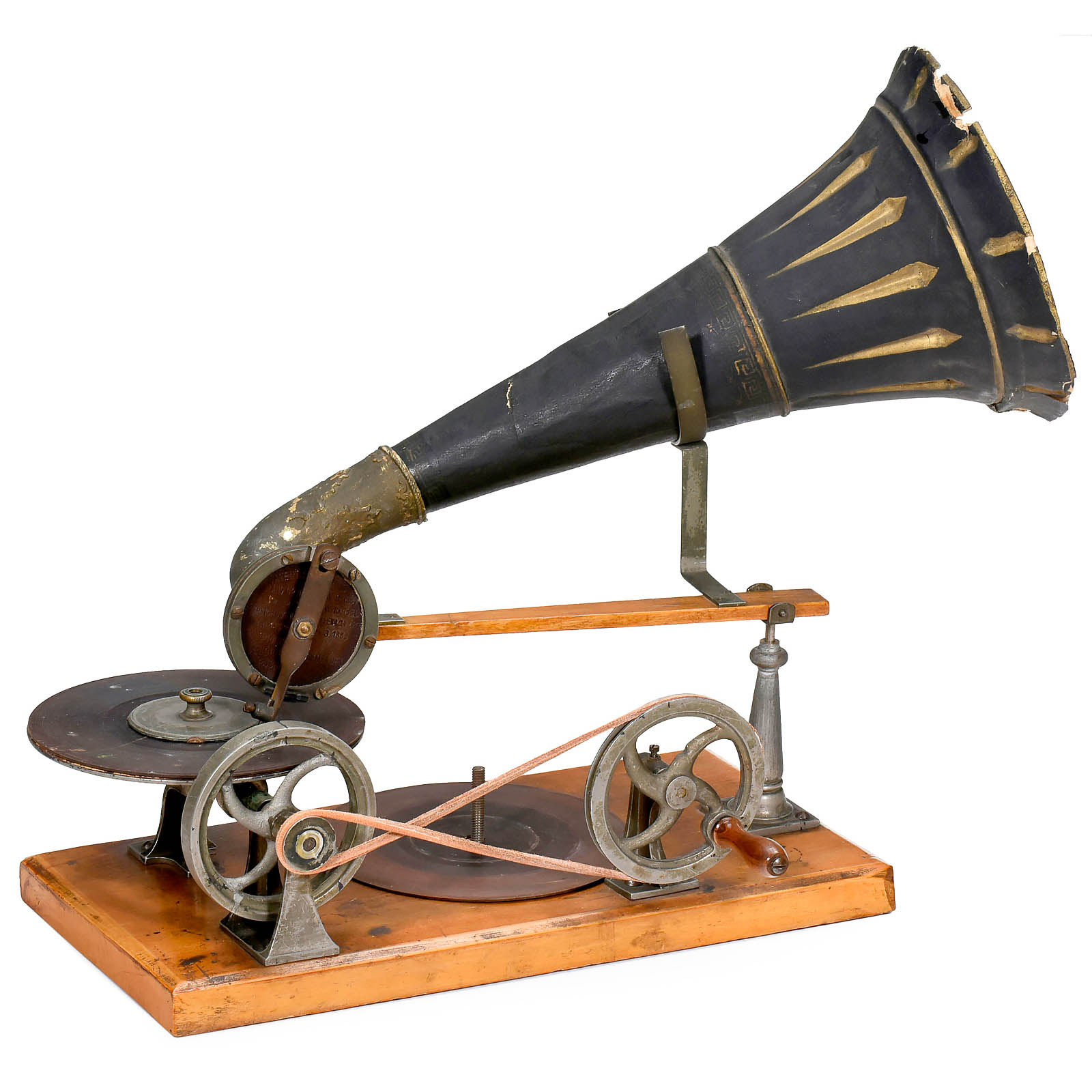 First series of production by Grammophon-Spielwaren-Fabrik Kämmer, Reinhardt & Co. of Waltershausen, with hand-cranked mechanism, papier-mâché horn, soundbox with patent date 8th Nov. 1887 and wood base with bolt for record-clamp, size: 11 ¾ x 6 in. (30 x 15 cm), horn damaged around edge, otherwise good original condition. Included are 2 (12-cm) hand-rubber records (nos. 37 and 490) with labels (one of "GFKC" (Grammophon-Fabrik Kämmerer & Co.) on the reverse). – The German emigrant Emile Berliner patented his invention on 8th November 1887 in Germany and America simultaneously, followed by patents in several other countries. Berliner's machine, however, awoke little interest in America at this time thanks to Thomas Edison's unveiling of an improved cylinder phonograph at the Paris World Exhibition of 1889. A year into his return to Germany, Berliner met with more success. Berliner carried out improvements to his design in the telephone factory of his brother Joseph in Hanover and made contact with a company willing to put his design into production: Toy and doll manufacturer Kämmer and Reinhardt. Around 600 records in various languages were produced. Discs were produced by Louis Rosenthal of Frankfurt. Despite European success, Berliner's big break-through in America came a few years later, albeit with a slightly modified design and appearance for the transatlantic market. – Provenance: From the estate of the successor to the former Emile Berliner recording studios in Hanover. – Literature: Fabrizio/Paul, "The Talking Machine", p. 27. – An important milestone in the history of recorded sound!