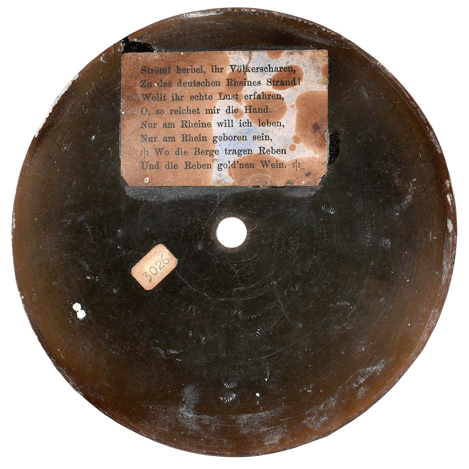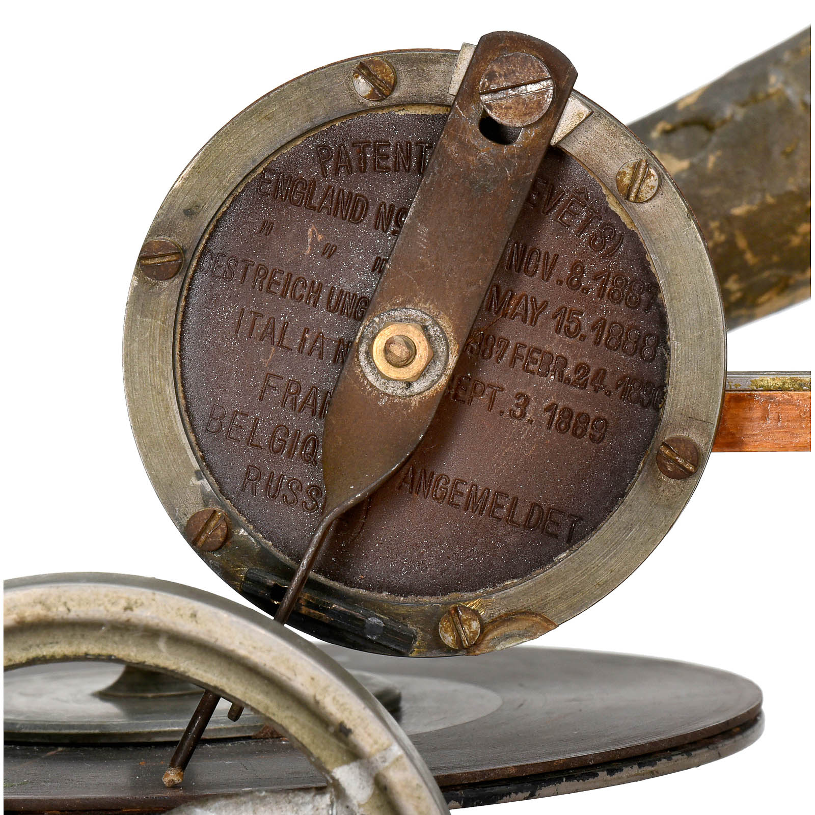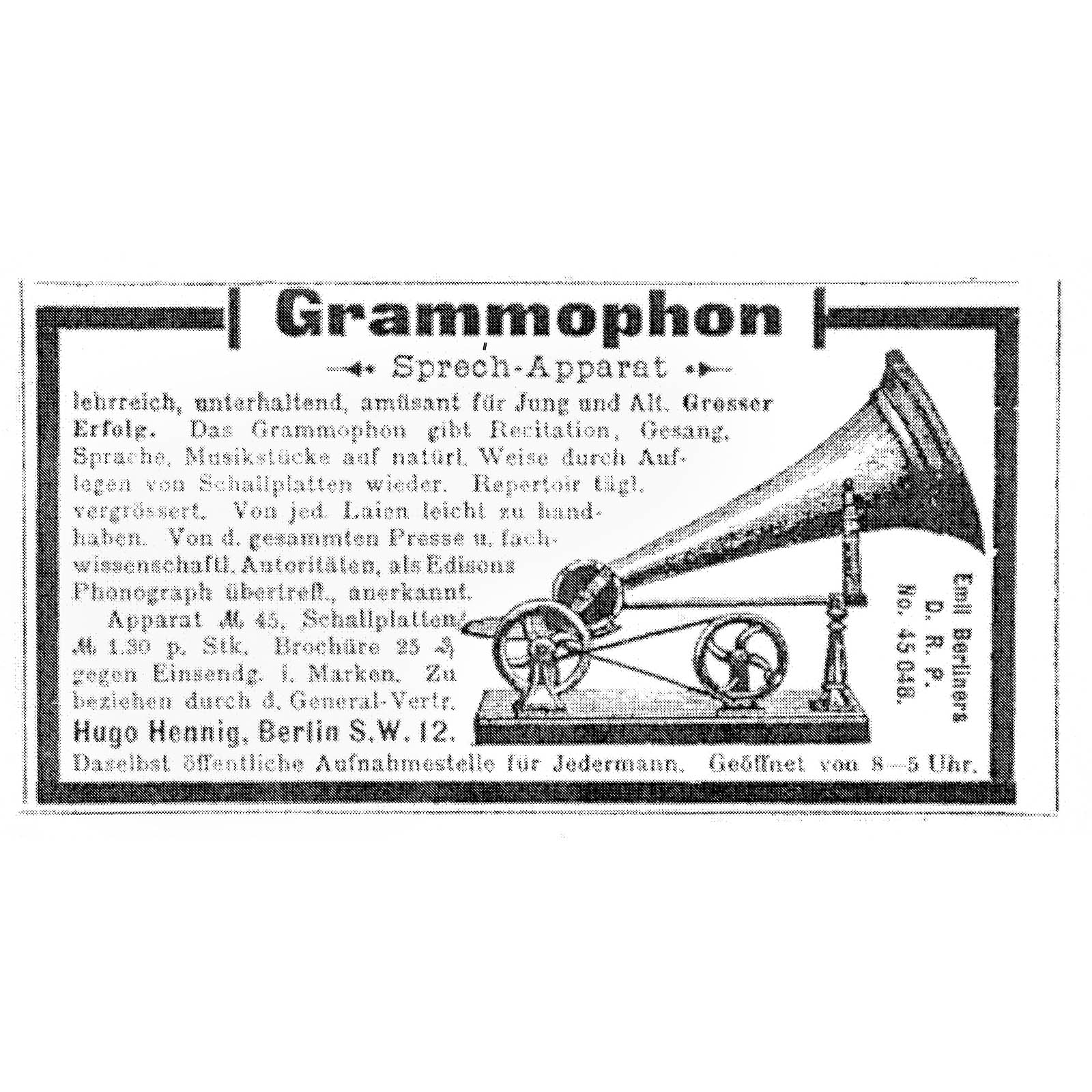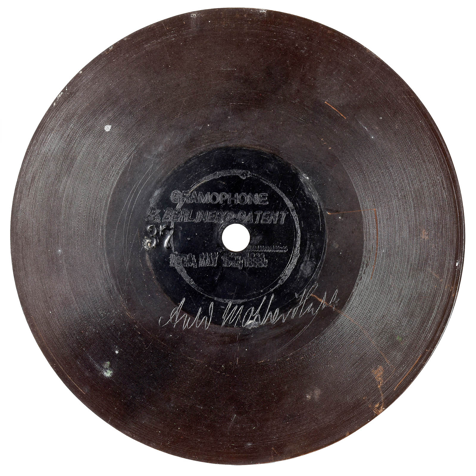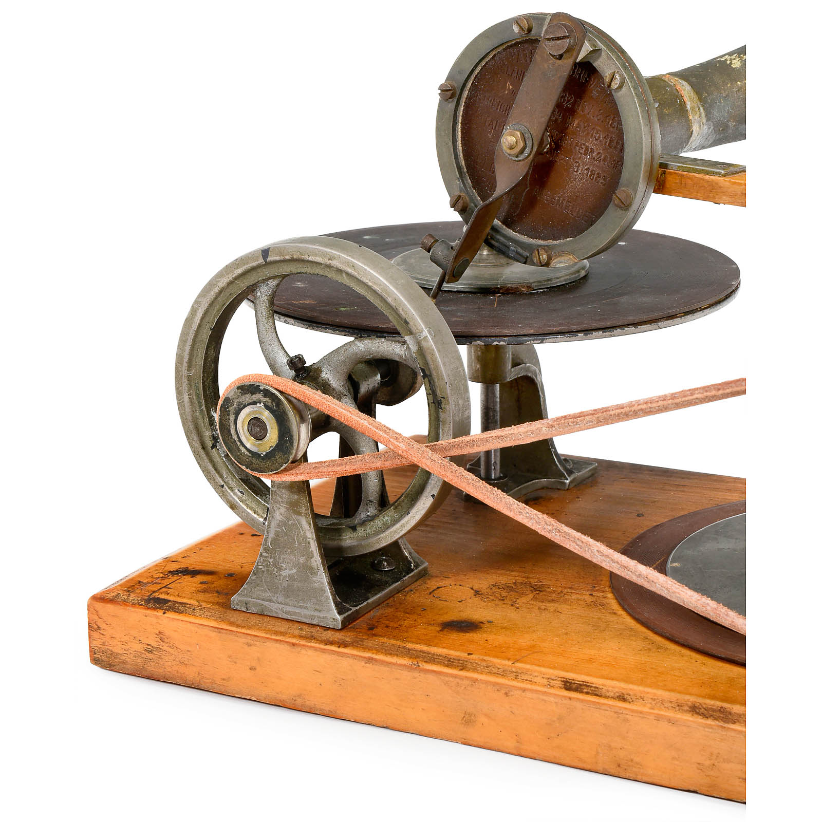 First series of production by Grammophon-Spielwaren-Fabrik Kämmer, Reinhardt & Co. of Waltershausen, with hand-cranked mechanism, papier-mâché horn, soundbox with patent date 8th Nov. 1887 and wood base with bolt for record-clamp, size: 11 ¾ x 6 in. (30 x 15 cm), horn damaged around edge, otherwise good original condition. Included are 2 (12-cm) hand-rubber records (nos. 37 and 490) with labels (one of "GFKC" (Grammophon-Fabrik Kämmerer & Co.) on the reverse). – The German emigrant Emile Berliner patented his invention on 8th November 1887 in Germany and America simultaneously, followed by patents in several other countries. Berliner's machine, however, awoke little interest in America at this time thanks to Thomas Edison's unveiling of an improved cylinder phonograph at the Paris World Exhibition of 1889. A year into his return to Germany, Berliner met with more success. Berliner carried out improvements to his design in the telephone factory of his brother Joseph in Hanover and made contact with a company willing to put his design into production: Toy and doll manufacturer Kämmer and Reinhardt. Around 600 records in various languages were produced. Discs were produced by Louis Rosenthal of Frankfurt. Despite European success, Berliner's big break-through in America came a few years later, albeit with a slightly modified design and appearance for the transatlantic market. – Provenance: From the estate of the successor to the former Emile Berliner recording studios in Hanover. – Literature: Fabrizio/Paul, "The Talking Machine", p. 27. – An important milestone in the history of recorded sound!