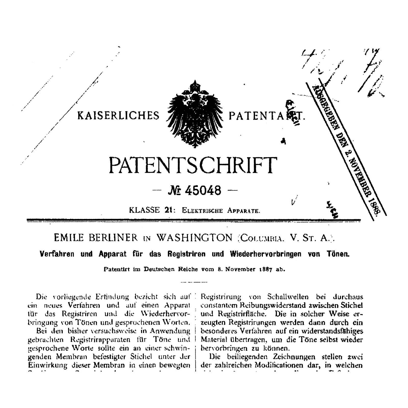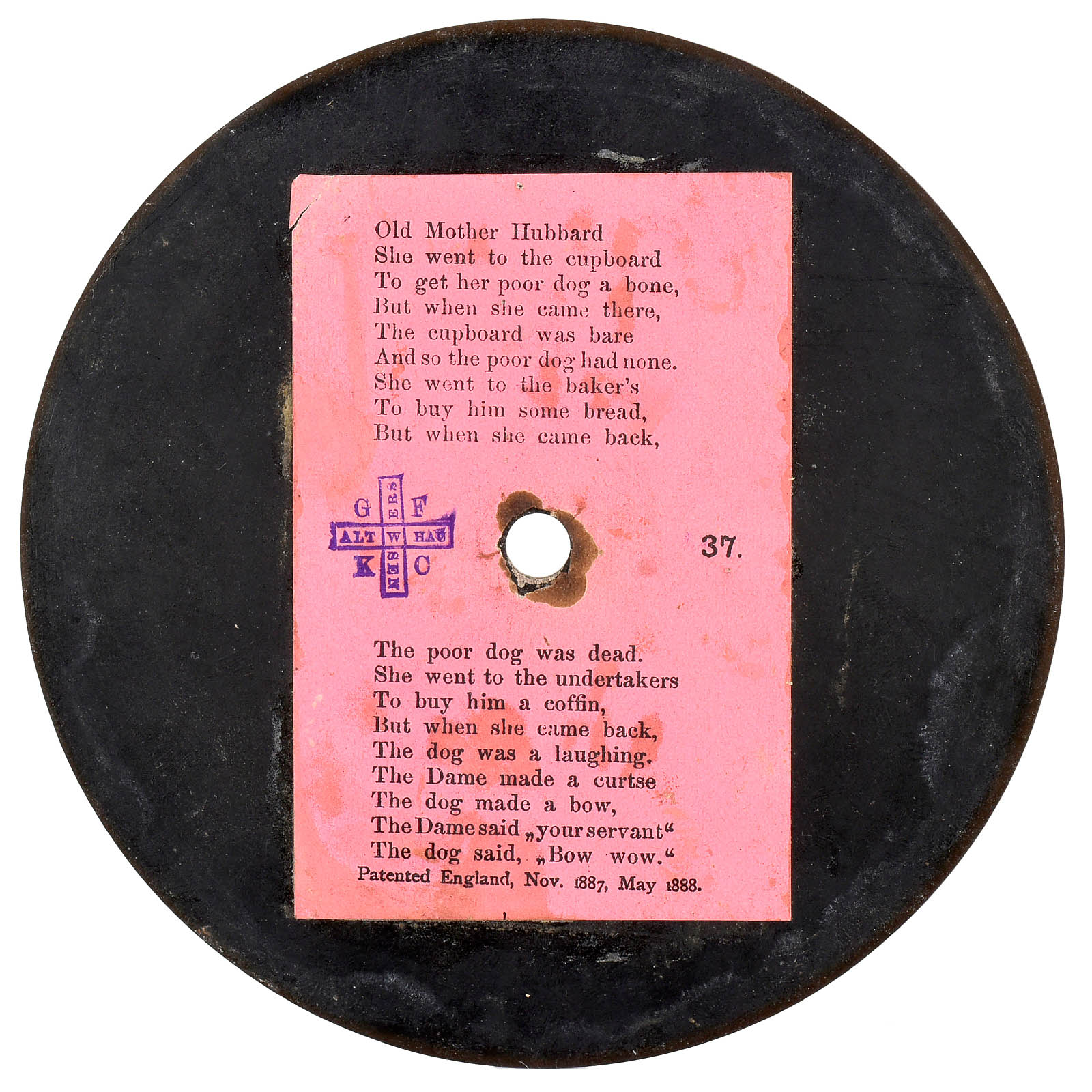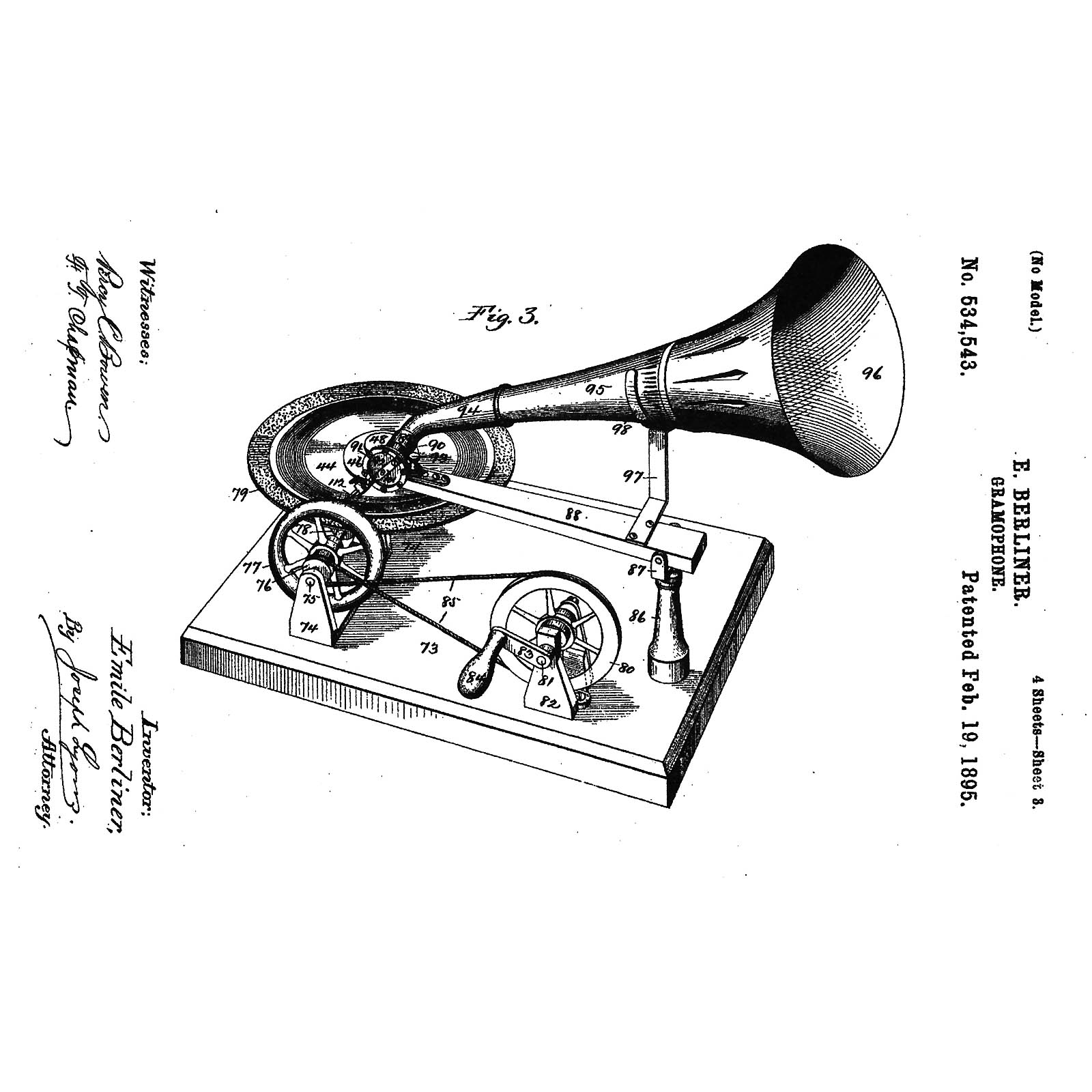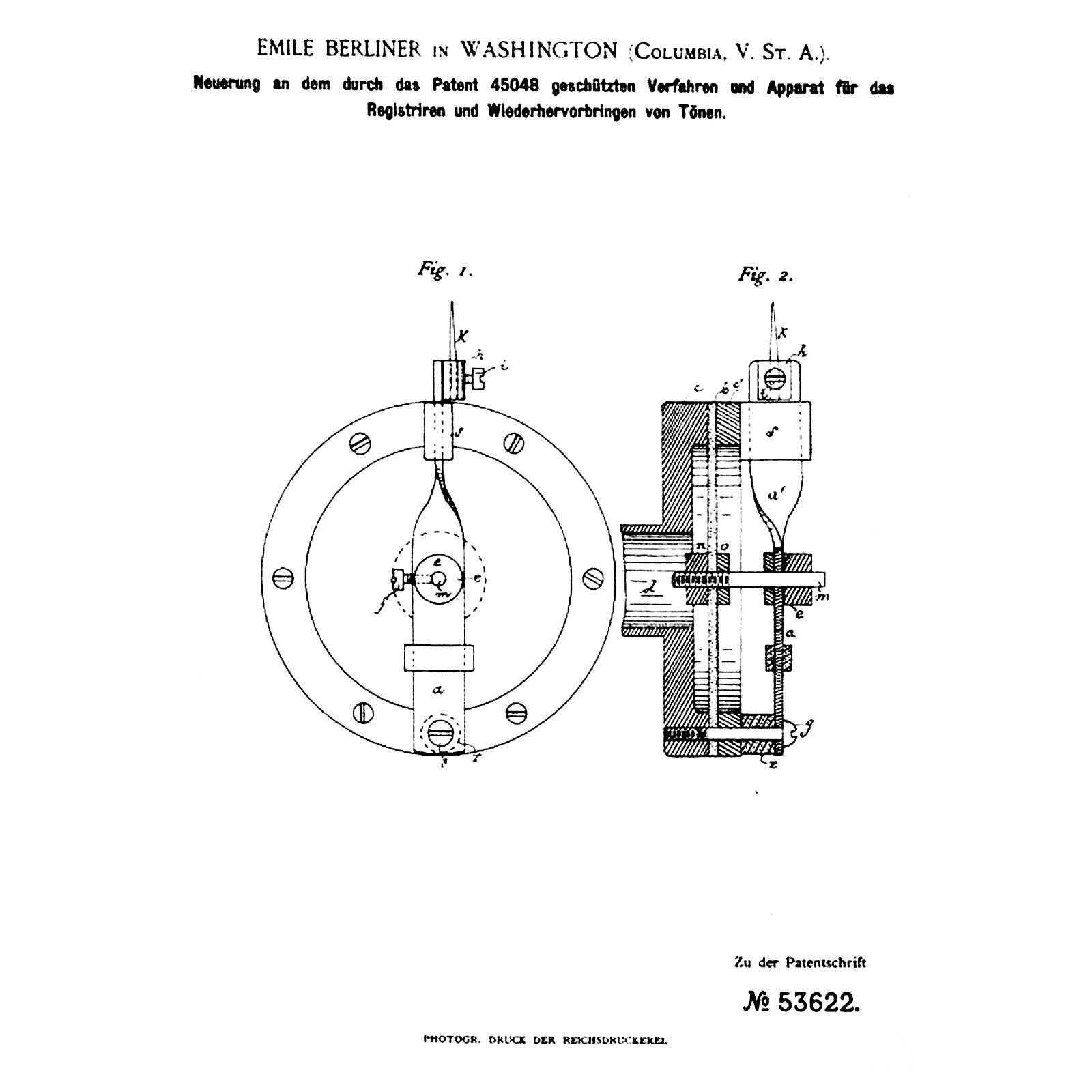 First series of production by Grammophon-Spielwaren-Fabrik Kämmer, Reinhardt & Co. of Waltershausen, with hand-cranked mechanism, papier-mâché horn, soundbox with patent date 8th Nov. 1887 and wood base with bolt for record-clamp, size: 11 ¾ x 6 in. (30 x 15 cm), horn damaged around edge, otherwise good original condition. Included are 2 (12-cm) hand-rubber records (nos. 37 and 490) with labels (one of "GFKC" (Grammophon-Fabrik Kämmerer & Co.) on the reverse). – The German emigrant Emile Berliner patented his invention on 8th November 1887 in Germany and America simultaneously, followed by patents in several other countries. Berliner's machine, however, awoke little interest in America at this time thanks to Thomas Edison's unveiling of an improved cylinder phonograph at the Paris World Exhibition of 1889. A year into his return to Germany, Berliner met with more success. Berliner carried out improvements to his design in the telephone factory of his brother Joseph in Hanover and made contact with a company willing to put his design into production: Toy and doll manufacturer Kämmer and Reinhardt. Around 600 records in various languages were produced. Discs were produced by Louis Rosenthal of Frankfurt. Despite European success, Berliner's big break-through in America came a few years later, albeit with a slightly modified design and appearance for the transatlantic market. – Provenance: From the estate of the successor to the former Emile Berliner recording studios in Hanover. – Literature: Fabrizio/Paul, "The Talking Machine", p. 27. – An important milestone in the history of recorded sound!
