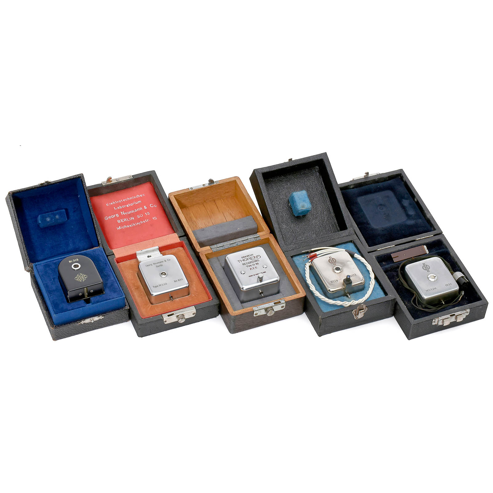 1) Neumann MS 52 H cutterhead. – 2) Thorens Recording Graveur Type G15. – 3) Neumann MS 33 cutterhead. – 4) Neumann R 12b cutterhead. – And: 5) Telefunken Ela T 104/1 pickup. – All in original boxes.