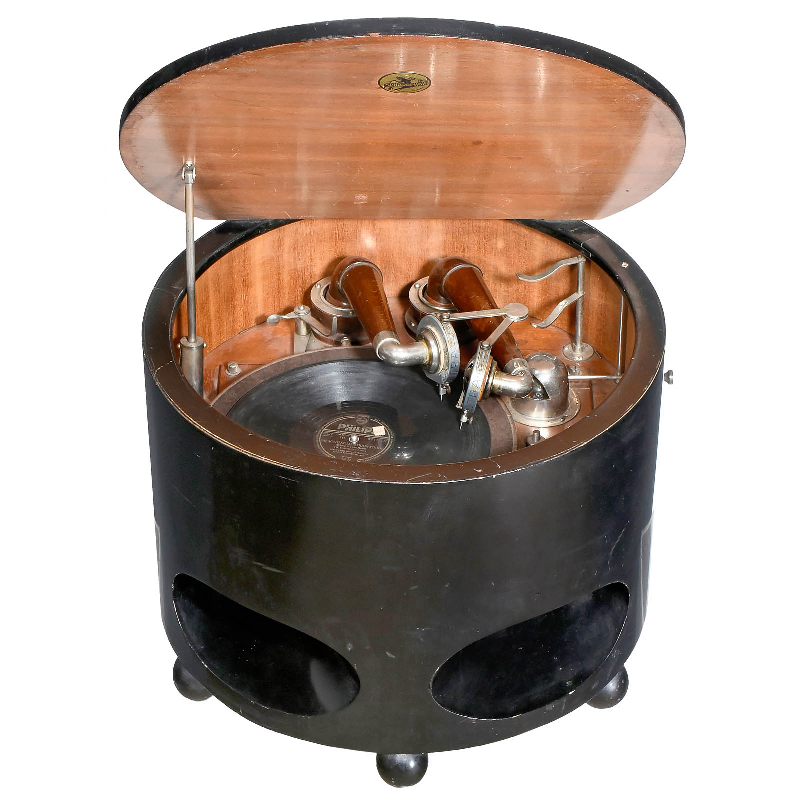 By "H.J. Küchenmeister, Berlin", double horn gramophone with 2 soundboxes, electric motor drive (110 V), interior light, automatic stop function, black-japanned circular wooden case Ø 19 5/8 in., good original working condition! One of the first "stereophonic" record players.