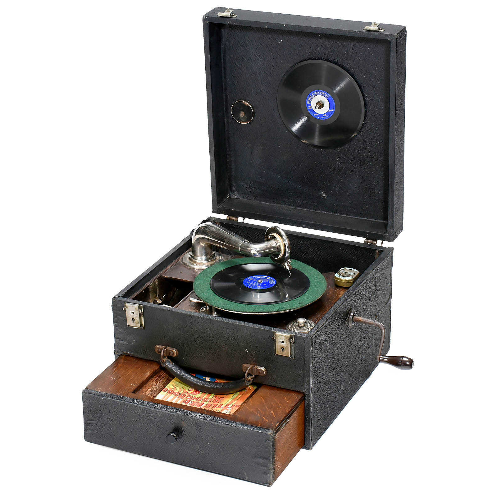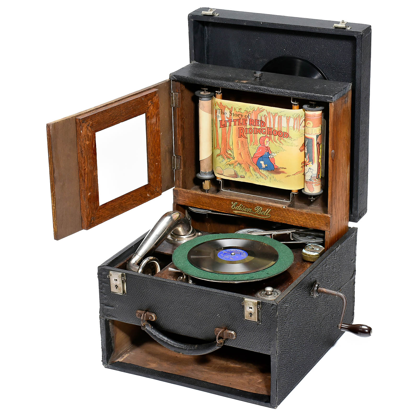 Rare portable panorama gramophone with moving picture spools, made in England by "Edison Bell Ltd., London", spring motor for both functions, removeable oak-framed "screen" stowing as a drawer during transport, Era soundbox and leatherette-covered case, 3 records (no. 1, 2 and 3) and 3 film strips. – Excellent working condition. – Early audio-visual collector's item! – Extremely rare! – Literature: Ch. Proudfoot, "Grammophone und Phonographen", Munich 1981, p. 71.