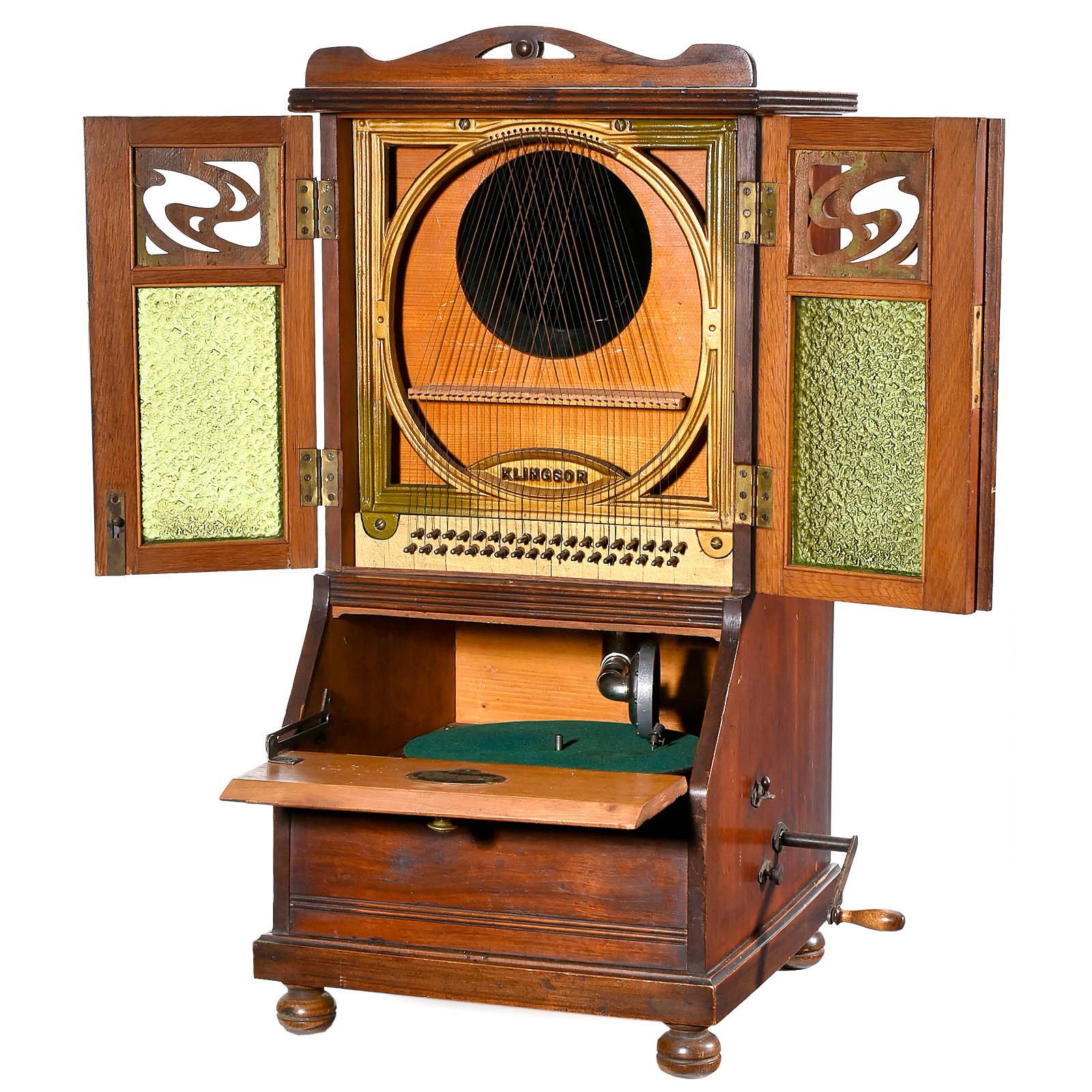 By "Krebs & Klenk, Hanau", walnut case, 2 glazed doors, front flap to turntable, original "Klingsor" soundbox, string-covered piano frame, working!