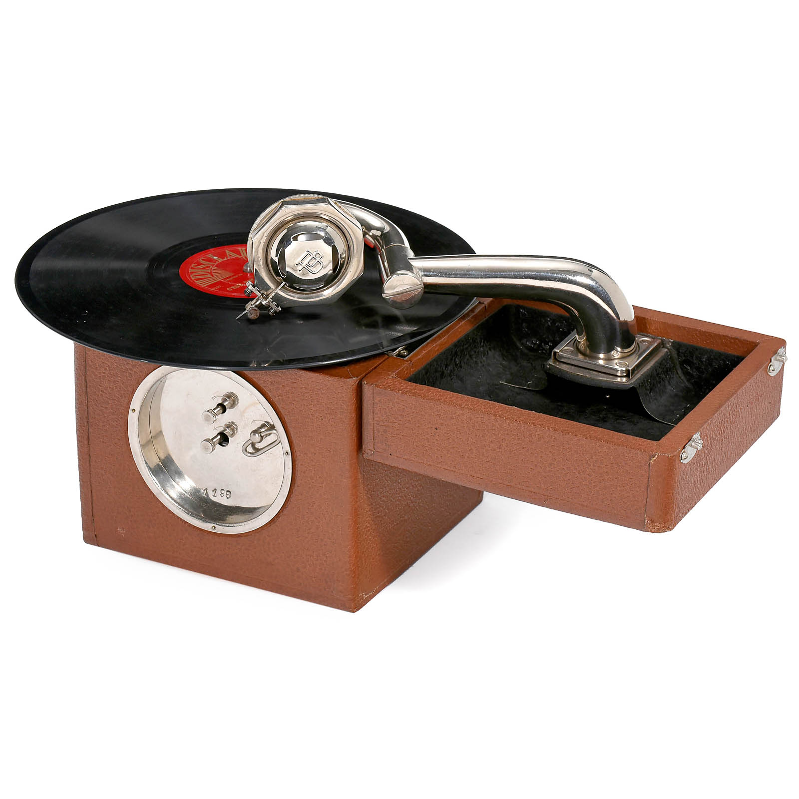 French portable gramophone, Peter Pan soundbox, spring-driven clock and turntable, automatic start by timer, working! The very first fully automatic gramophone alarm clock.