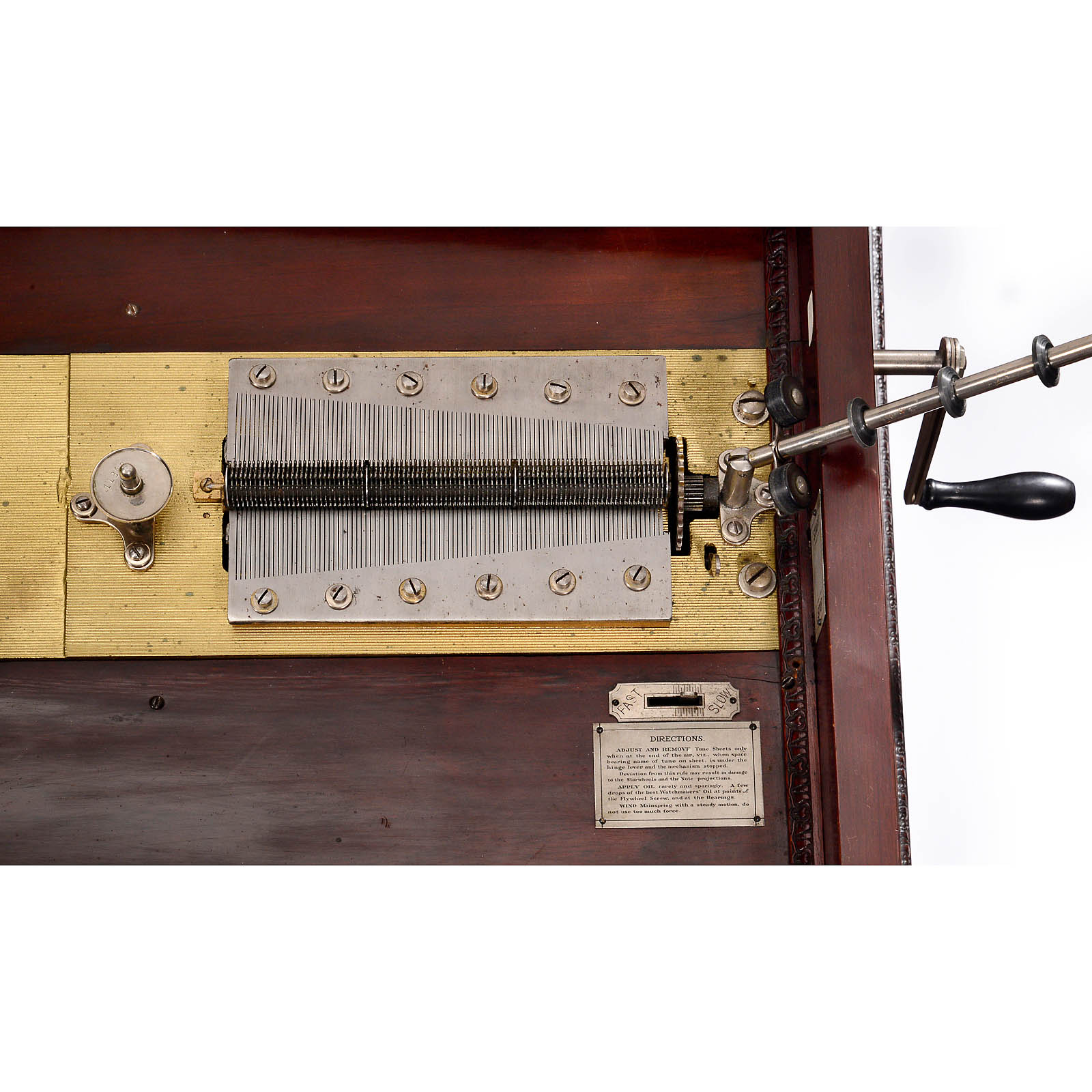 Manufactured by "F.G. Otto & Sons, USA", no. 11846, with 184 teeth in duplex comb, carved mahogany cabinet on matching disc-storage stand with 13 compartments, overall size 31 x 27 ½ x 45 in., with 15 discs. The Olympia also plays Criterion discs. A rare American musical box, in excellent playing condition.