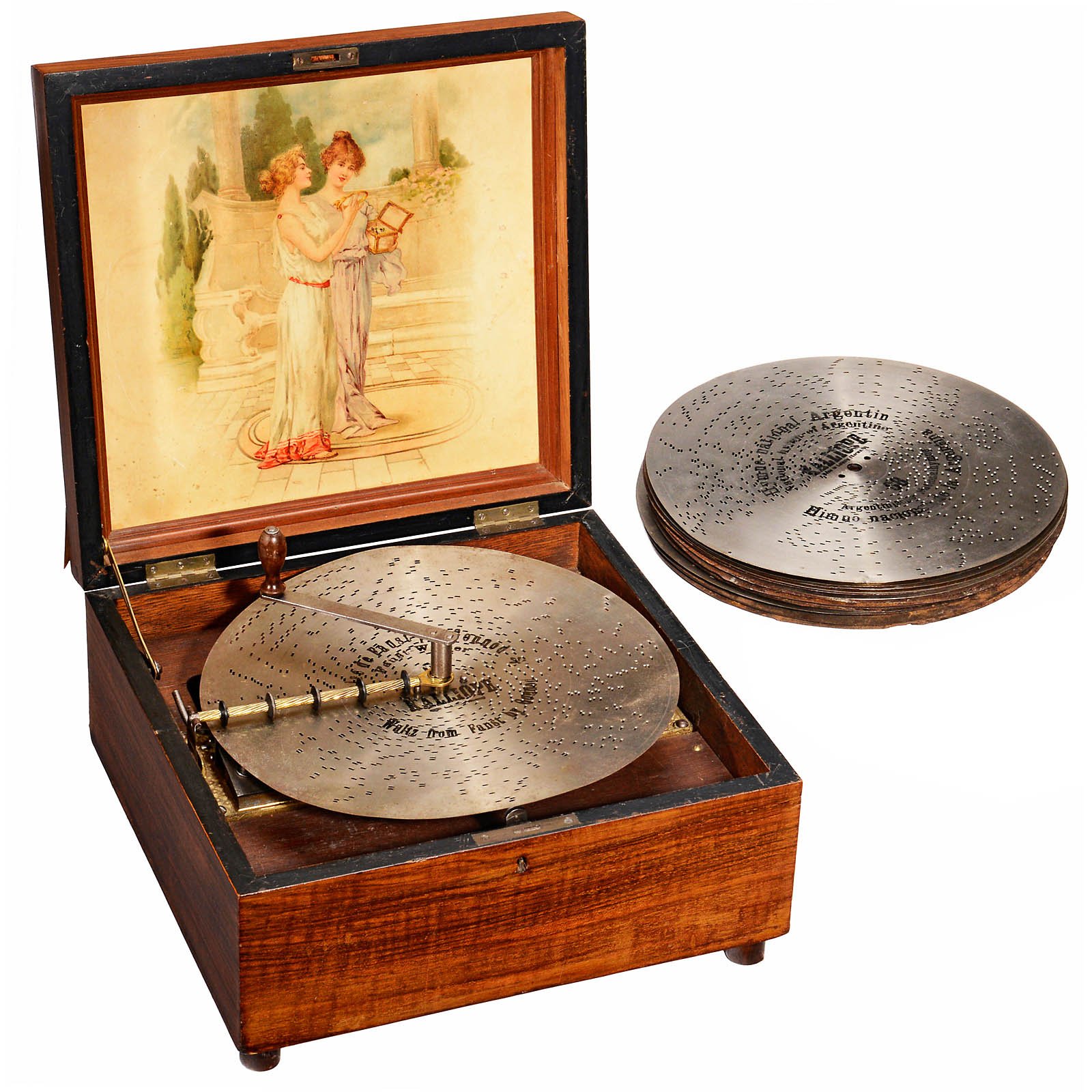 Manufactured by "Kalliope Musikwerke, Leipzig", for 13 1/3 in. discs, 61 teeth in comb (complete), 10 optional bells, lid with original lithograph, case with minor damages. Very good playing condition! With 20 discs.