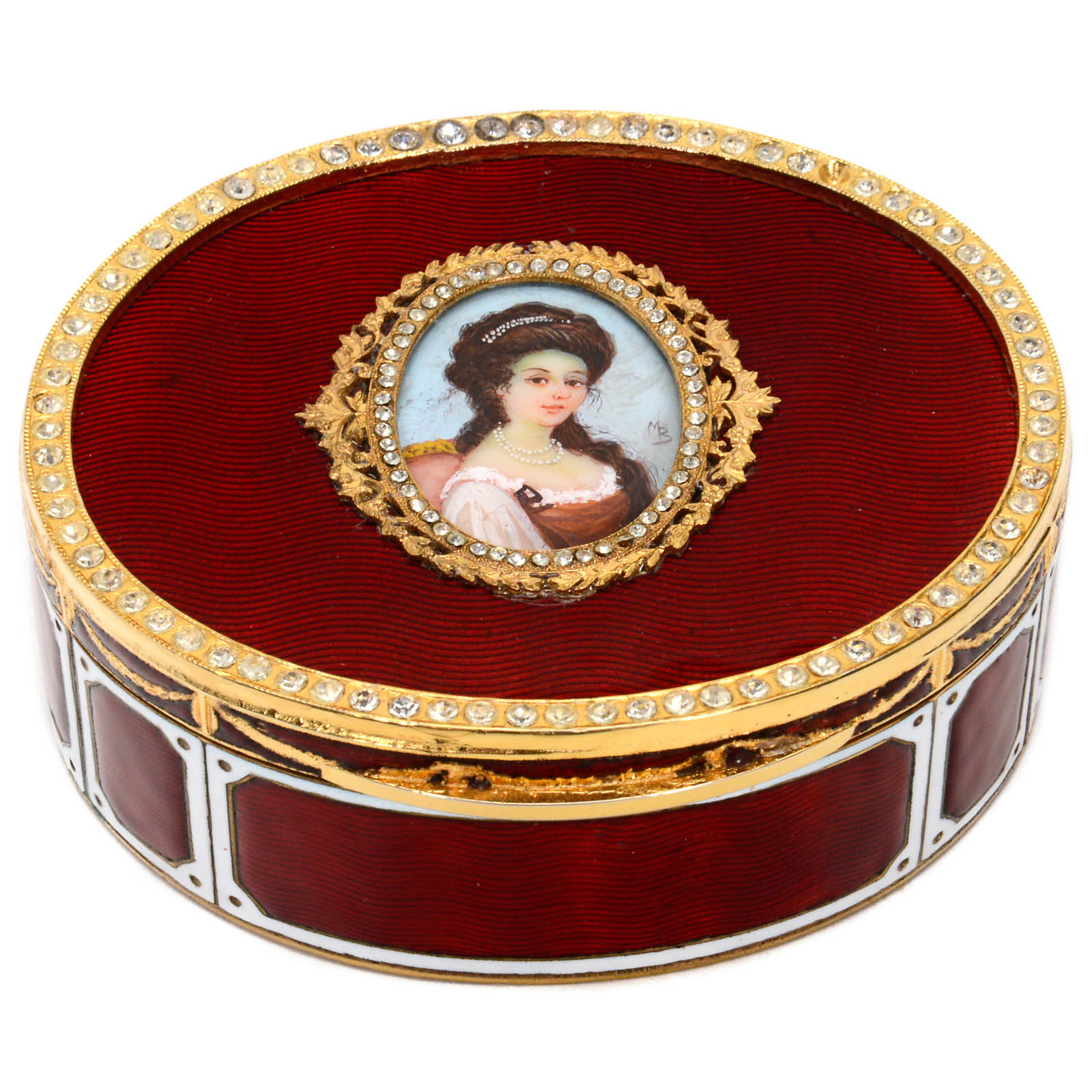 With small Reuge cylinder movement, in 18th century-inspired case with maroon panels in white borders, lid with portrait miniature of a lady in décolleté gown, signed "MB", in surround of imitation diamonds, width 3 ½ in. (8,8 cm). Working order!