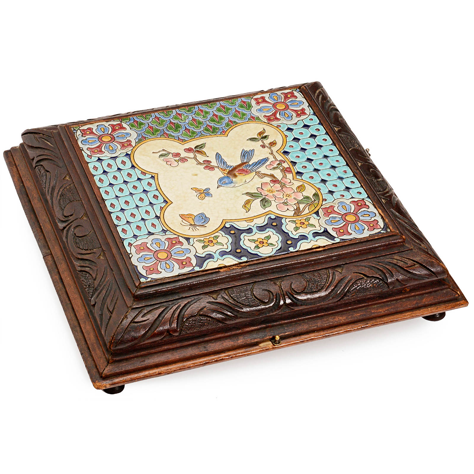 Large polychrome majolica tile, on carved wooden base, with Swiss 8-air movement and table bell, size 12 ¼ x 12 ¼ in., working.