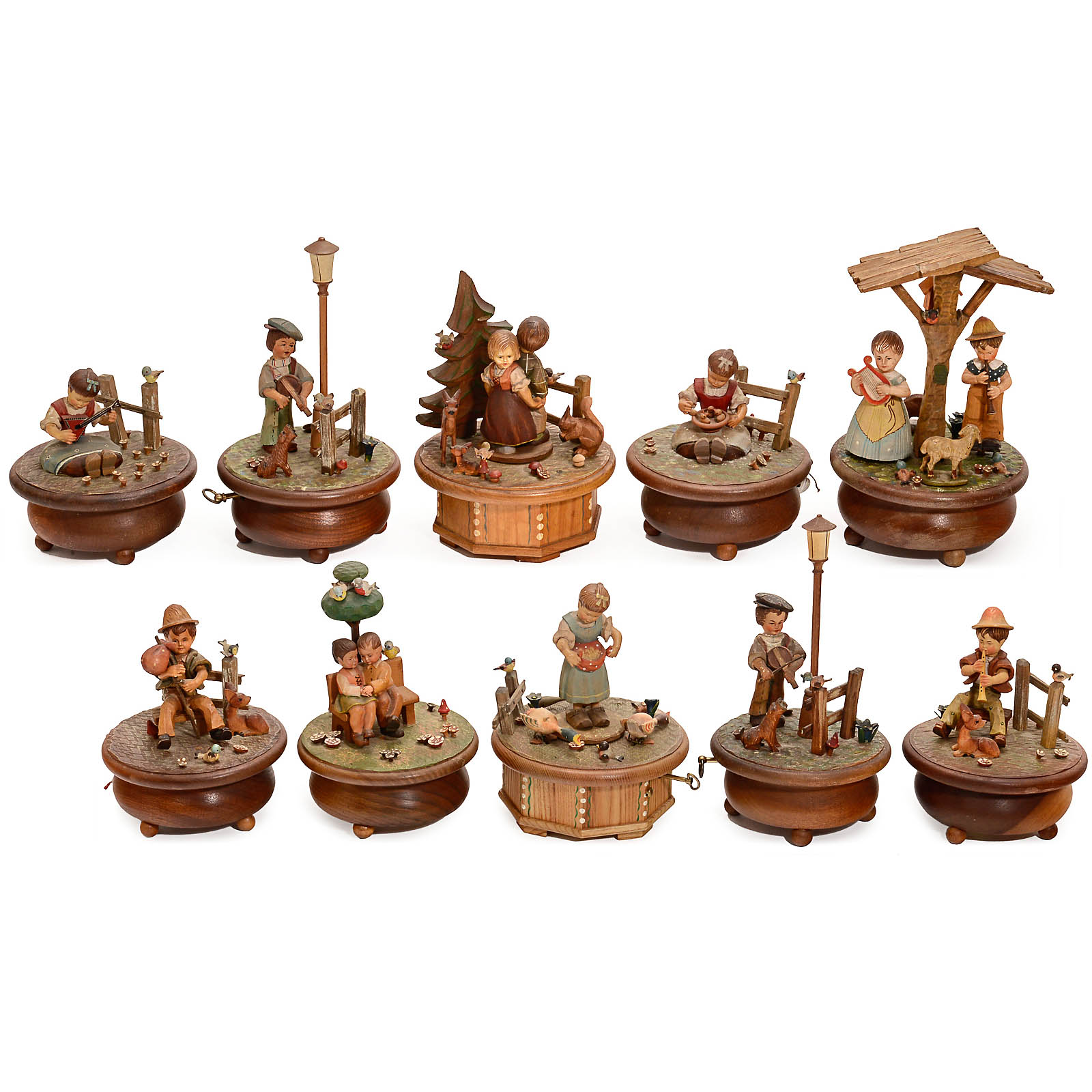 Cases by "Anri", Italy, and from the Erzgebirge, GDR, with Swiss musical movements by "Reuge" and "Thorens", all movements are playing.