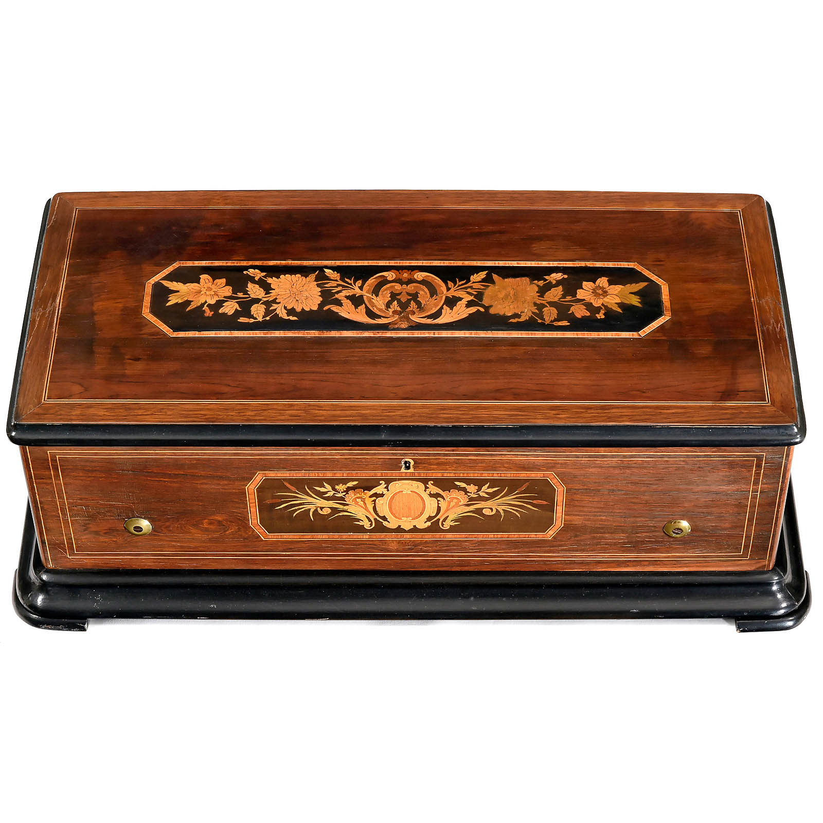 No. 14903, playing one overture and five airs on 'fat cylinder', with 132 teeth in comb (complete), "BAB" stamp on governor-cock, compensated governor, tune-sheet and rosewood-veneered case with marquetry inlaid front and lid, wd. 26 in. (66 cm), cylinder 14 in. (36 cm) x 3 ¼ in. (8,4 cm) diameter. Repertoire: "March of the King Louis XIII", "Fra Diavolo, Motifs de l'Opéra" by Auber,"Une Nuit à Grenade, Ouverture" by Kreutzer, "Stradella, Motifs de l'Opéra" by Flotow, "Le Barbier de Seville, Motifs de l'Opéra" by Rossini and "The Wedding March" by Mendelssohn. – "Une Nuit à Grenade" (The Night Camp in Granada) is a two-act romantic opera by Conradin Kreutzer, first performed in 1834 in Vienna. The opera is rarely found in mechanical music. – This musical box features some superb arrangements of just under 1 ¾ minutes per revolution. The movement is in excellent restored playing condition!