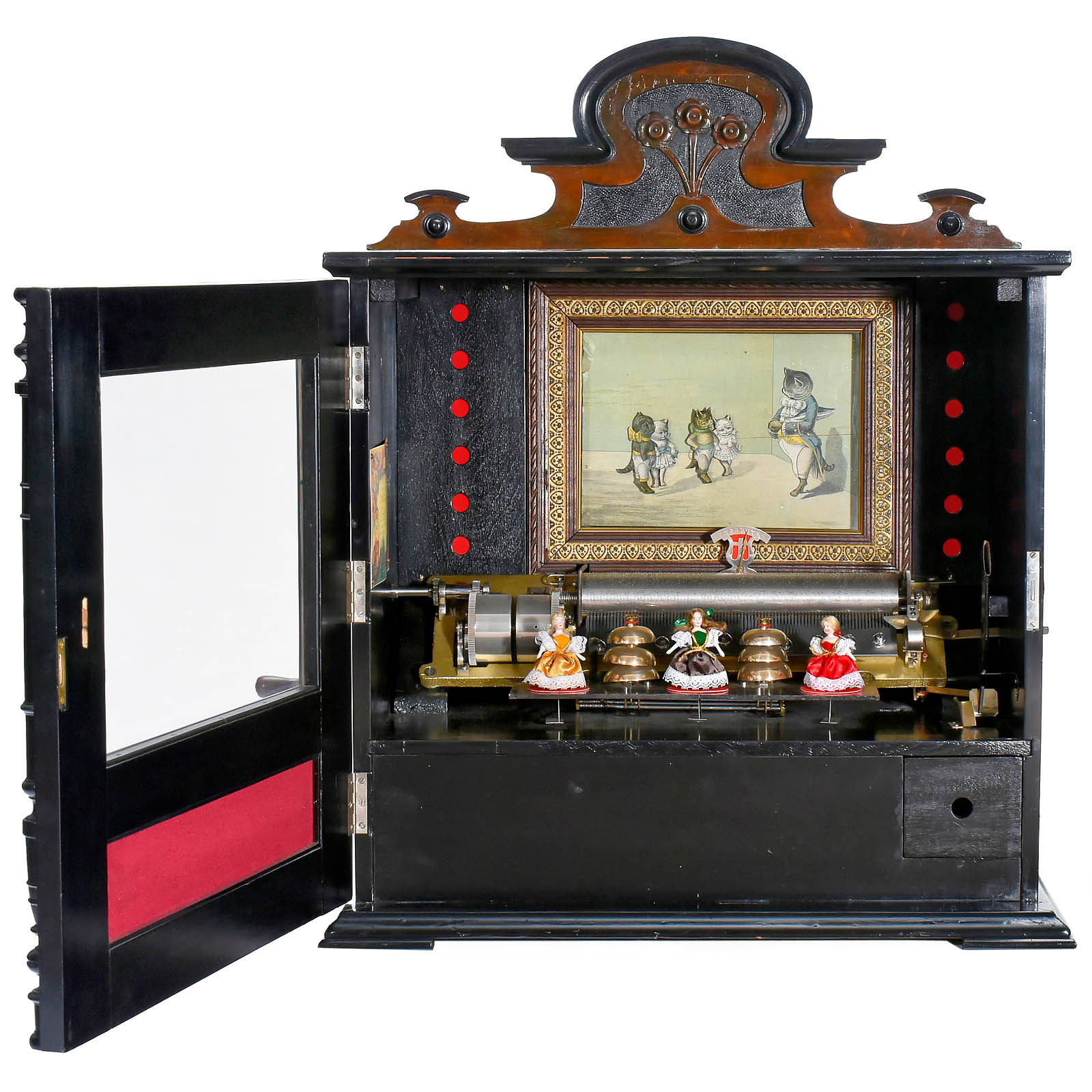 No. 10240, playing eight airs accompanied by three dancing dolls, six optional bells mounted in two vertical stacks and a chromolithographed automaton picture of three dancing kittens and their feline dancing master, with coin-activated nickel-plated movement, 92 teeth in two combs (complete), tune-indicator and replica tune-sheet, in typical walnut-veneered case with glazed door, coin-slot, stop/start on the side (added) and pediment, 29 in. (74 cm) wide x 26 ½ in. (67 cm) ht. x 20 in. (51 cm) dp., the cylinder 13 in. (33 cm). Movement in excellent restored playing condition, restored case with replacement parts including the coin-trip, drawer, dolls and picture-fascias. – Literature: Lot illustrated in Darren Hesketh, "Penny-in-the-Slot Automata and the Working Model", 2005, p. 184. – Impressive audio-visual exhibition piece.