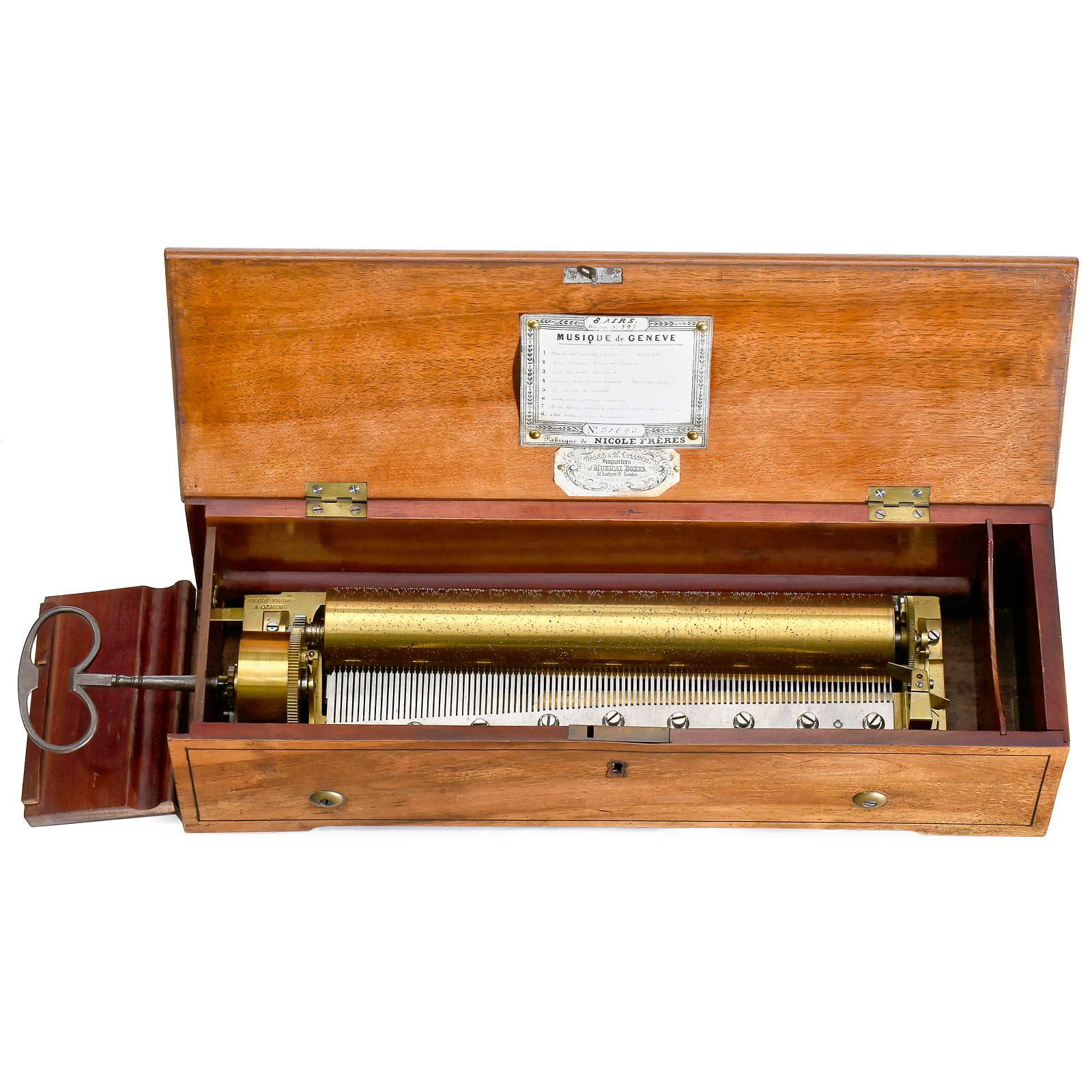No. 31693, playing eight airs from the operas "Puritani", "Somnambula" and "Norma", Gamme No. 897, with 97 teeth in comb (complete), brass bedplate, instant-stop control, tune-sheet and label of "Wales & Mc.Culloch, Importers of Musical Boxes, 32 Ludgate St., London", in fruitwood case with endflap, red interior and ebony stringing, width 20 ½ in. (52 cm), cylinder 13 in. (33 cm), with large steel key. Movement in excellent, restored playing condition. – A well-arranged musical box with an unusual program dedicated to the work of a single composer. – Literature: Nicole Frères No. 31847 with identical program was sold at Auction Team Breker on 25 May 2013, lot 437.