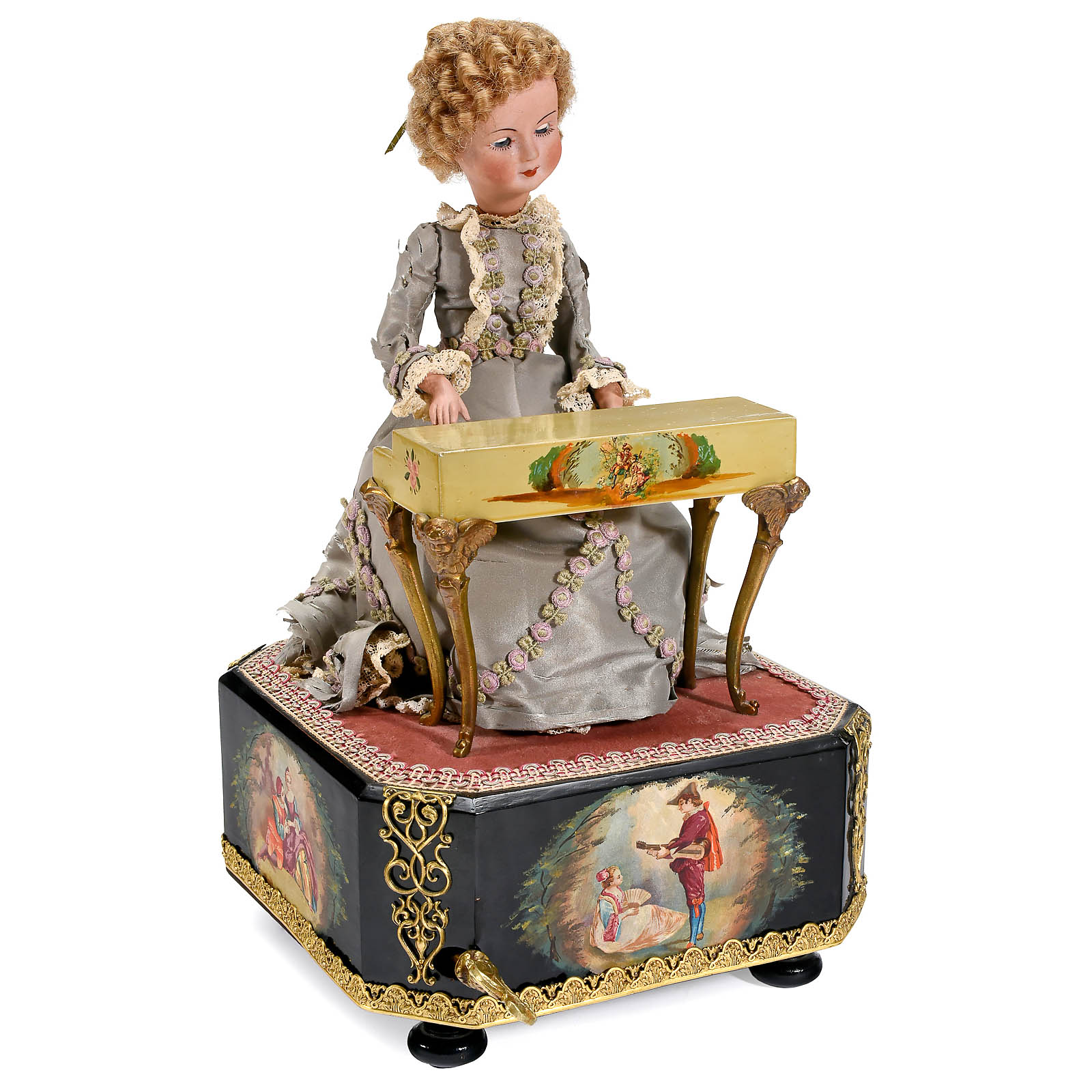 Parun, France, with bisque head, fixed blue glass eyes, mohair wig and (very fragile) original olive silk costume, sitting at paint-decorated harpsichord on black-lacquered base decorated with chromolithograph scenes of courting couples. The two-air cylinder movement causing figure to turn and bow her head gracefully as her hands move across the keyboard, ht. 13 ¾ in. (35 cm), good working condition, under antique glass dome, total ht. 16 in. (40 cm). Deluxe edition of a classic Farkas automaton. For biographical information about Jean and Anne Farkas: http://www.museedebaden.fr/pages/expositions-permanentes/salle-anne-et-jean-farkas.html.