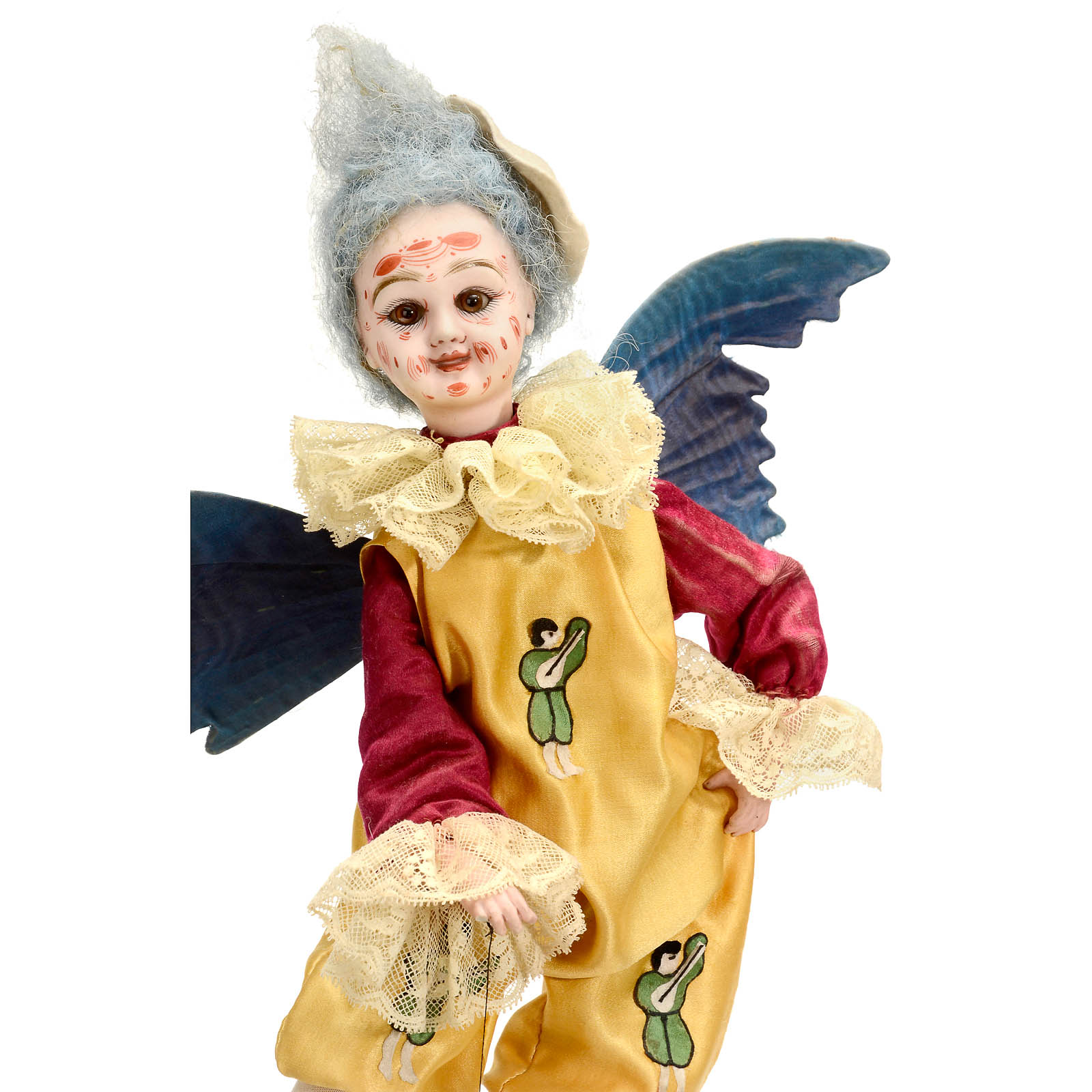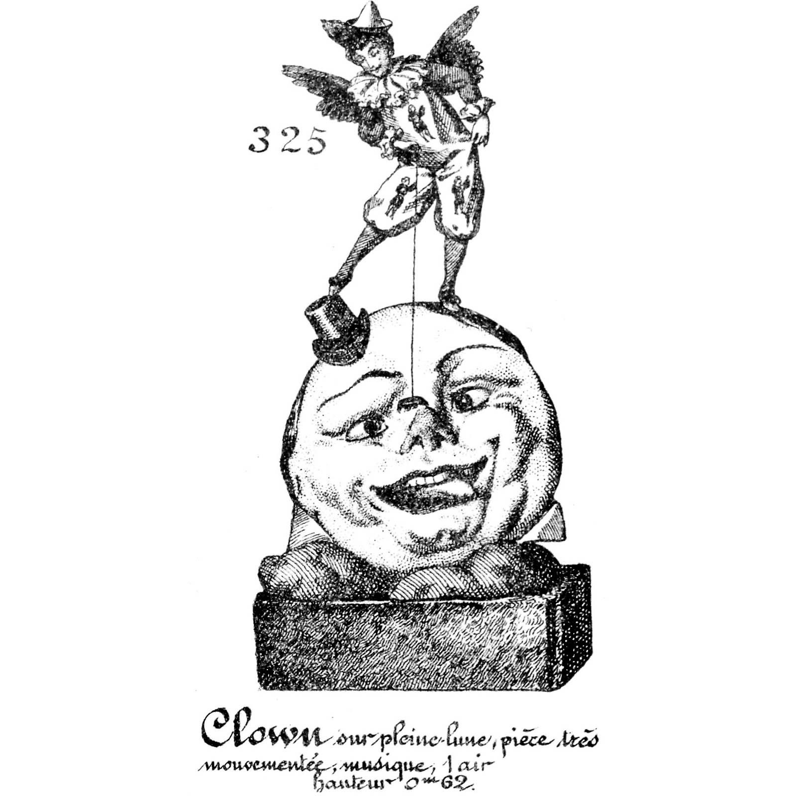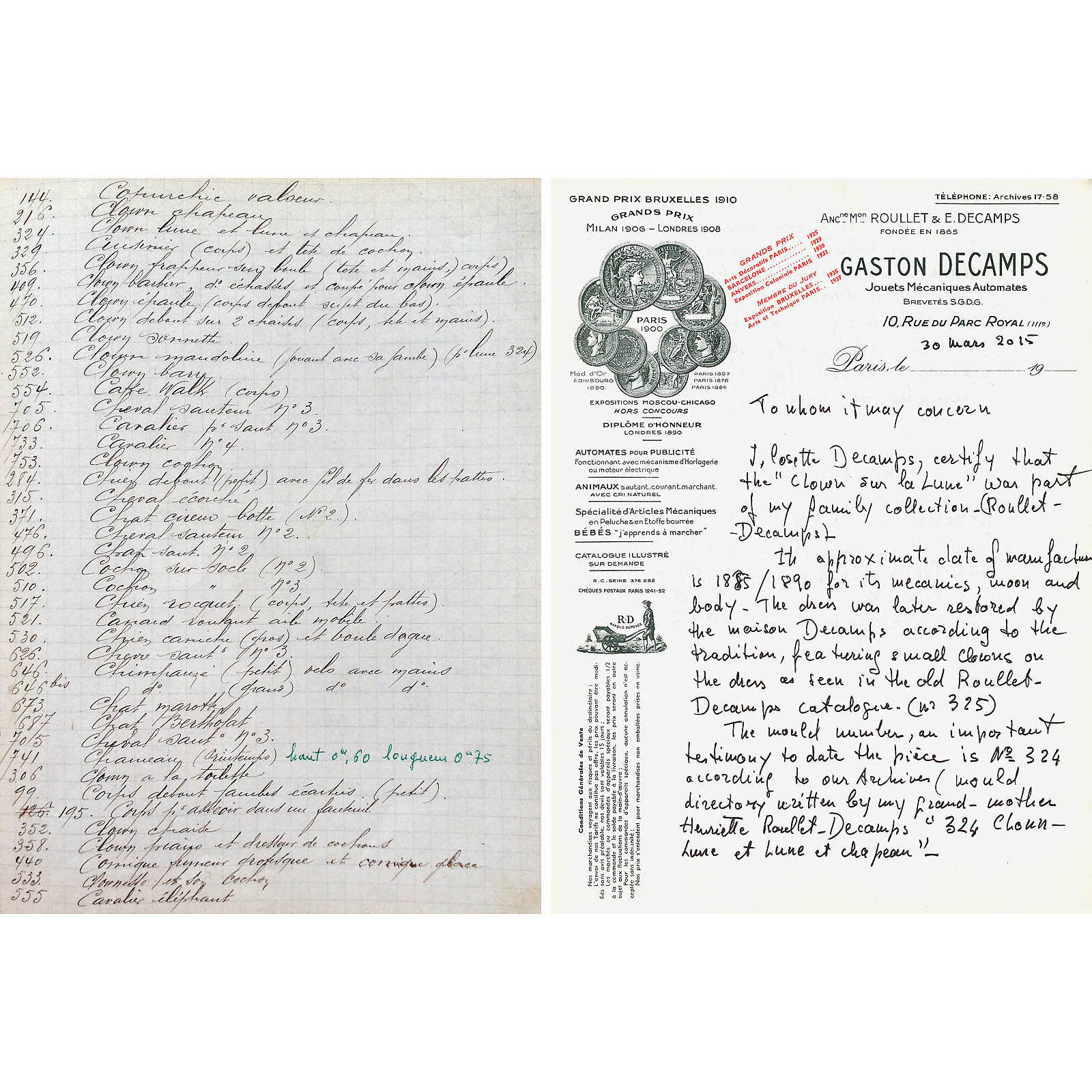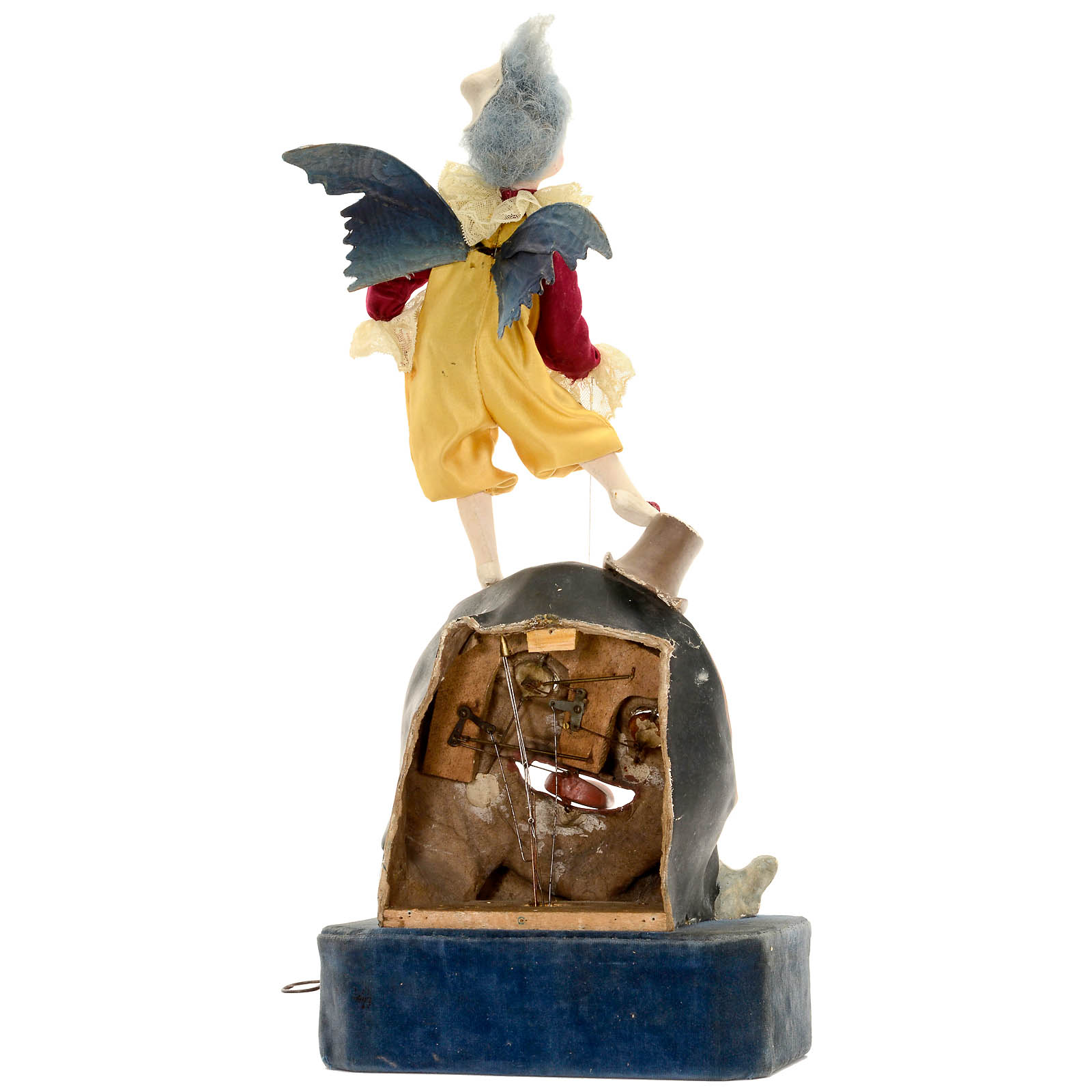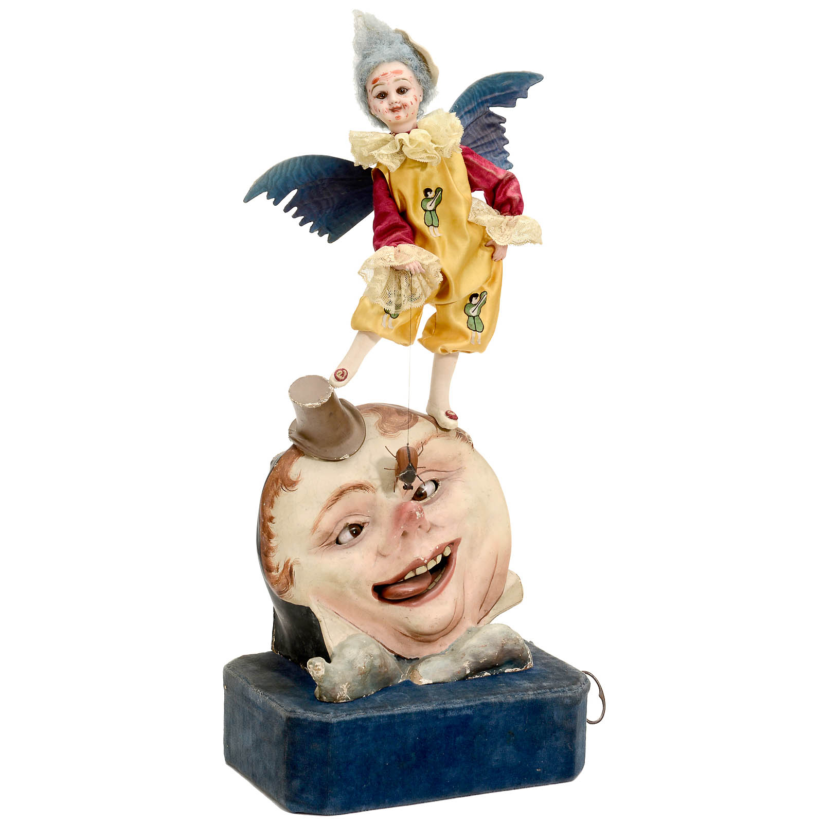 Depicting a winged clown teasing a papier-mâché full moon with a beetle on a string, the clown with bisque head (Paris Bébé model) stamped "Déposé Tête Jumeau, Bte. S.G.D.G. 1" and artists's marks "HIII", closed smiling mouth, full cheeks, fixed brown glass eyes, painted make-up, pierced ears, blue mohair wig, bisque hands and yellow satin costume with maroon sleeves and silk-covered wings, one foot resting on the moon's top hat, the moon with original paint, open mouth with modeled teeth, articulated tongue and brown paperweight eyes, on velvet-covered base containing two-air going-barrel mechanism, ht. 25 ½ in. (65 cm). Good working condition. – The clown nods his head and flutters his wings as he lowers the beetle in front of the moon's nose, causing him to cross his eyes and stick out his tongue in confusion! – The moon was a popular motif for automata-makers at the end of the 19th century, but the "Clown sur la Lune" by Roullet et Decamps and the "Lune Fin de Siècle" by Vichy were the most famous examples of automata featuring the full moon as a human face. This iconic image, along with Jules Verne's novels "De la Terre à la Lune" (1865) and "Autour de la Lune" (1870), may have been the inspiration for George Méliès's silent film "Voyage dans la Lune" (1902), where the moon is depicted in the same way. – Provenance: Decamps family collection. Accompanying the automaton is a letter from Cosette Bellancourt-Decamps (daughter of Gaston Decamps and proprietor of SARL Decamps from 1972 until its closure in 1994) regarding the history of this piece: "I, Cosette Decamps, certify that the 'Clown sur la Lune' was part of my family collection (Roullet Decamps)." – Its approximate date of manufacture is 1885/1890 for its mechanics, moon and body. The dress was later restored by the Maison Decamps according to the tradition ... The mould number, an important testimony to date the piece, is No. 324 according to our archives: mould directory written by my grandmother Henriette Roullet-Decamps "324 Clown Lune et Lune et Chapeau". – Literature: Christian Bailly, "Automata, the Golden Age", pp. 144 and 312.