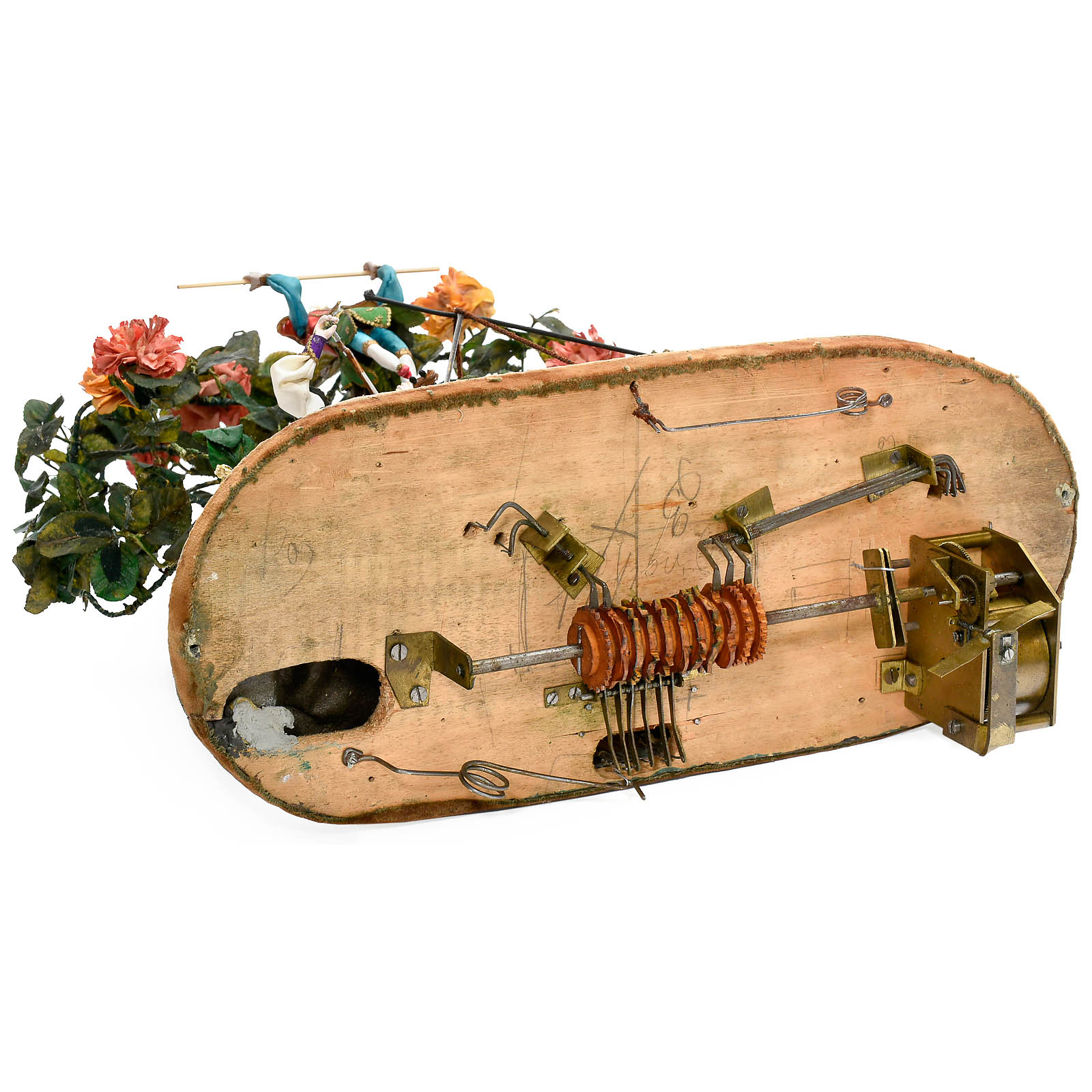 Depicting dancer flanked by harpist and fiddler under a flowering tree, all three figures with bisque heads, moulded blonde hair, painted eyes and partly original paper-trimmed costumes, on ebonized base containing two-air pull-string cylinder movement and going-barrel automaton movement with eleven boxwood cams that cause the dancer to leap en-pointe, kick his legs alternately and raise and lower his head while the musicians look from side to side, the fiddler bows with his right arm and the harpist plucks the strings with movements of both arms, ht. 26 ½ in. (68 cm) including antique glass dome, with size 13 key. Attractive example of a popular genre, in good working condition. –Provenance: ex-collection of Jerry Steinbaum, Los Angeles. Silber & Fleming of London advertised "mechanical rope dancers" for £ 12, 12 shillings in their 1884 catalog.