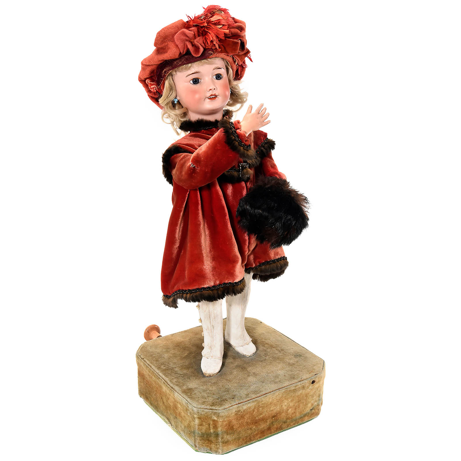 With bisque head impressed "S.F.B.J. Paris, 24, France", open mouth, fixed blue glass eyes, pierced ears with earrings and original blonde mohair wig, the left arm holding a fur muff, the right arm articulated at the elbow and shoulder, with single-air going-barrel movement, dressed in the original velvet winter coat, matching ribbon-trimmed felt hat and side-buttoned white kid boots, ht. 24 ½ in. (63 cm), on characteristic velvet-covered base of 8 in. square, with crank key and Decamps stop/start. The automaton appeared in Gaston Decamps' catalog under the title "Bébé Manchon" as well as "Bébé Frileux" ("Shivering Child"). – The girl turns her head, move her hands apart, slowly raises her right arm to throw kisses, then returns her hand to the muff and shrugs her shoulders as though sighing or shivering. – An automaton with unusually lifelike movements, in good working order!