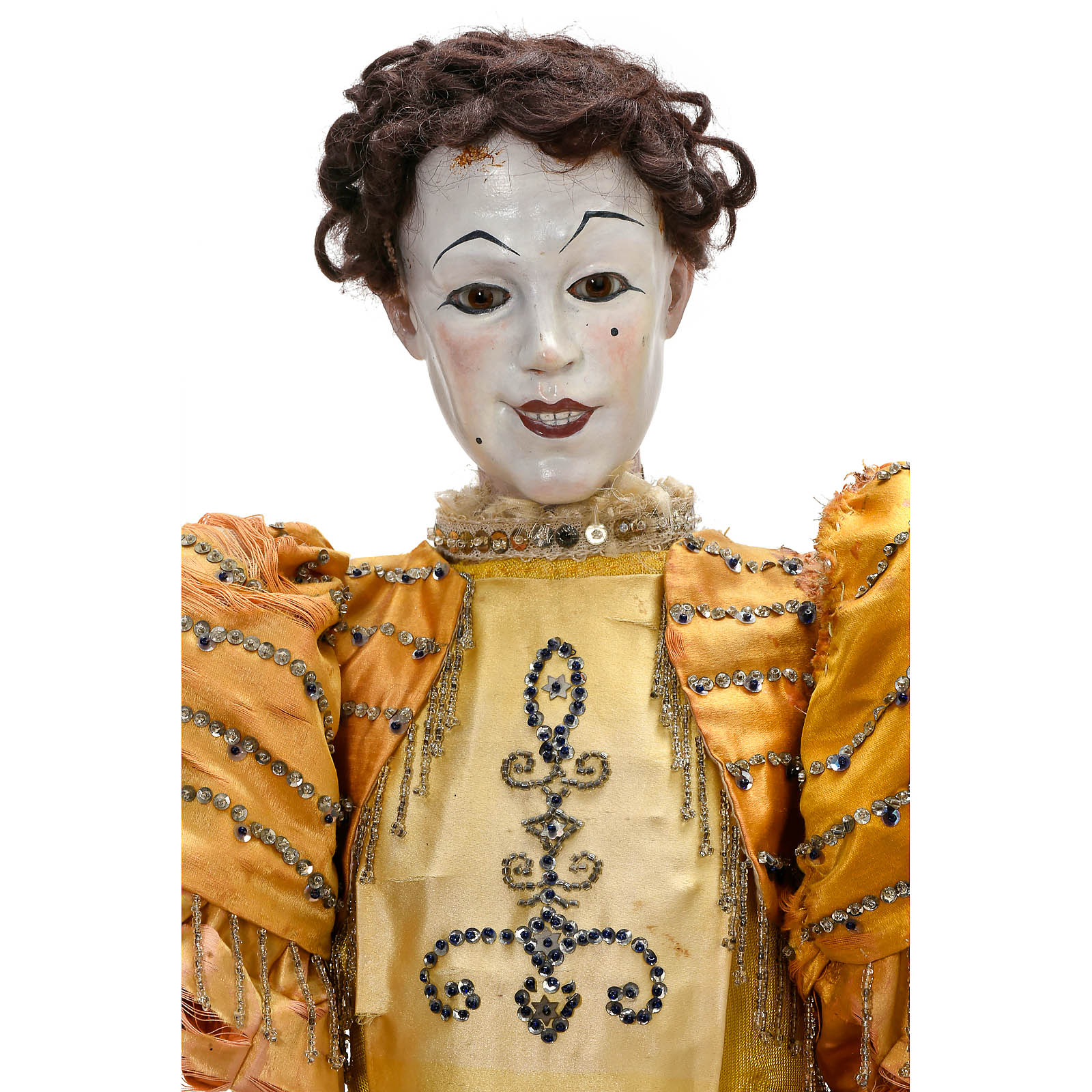 With plaster-composition head, fixed brown glass eyes, open smiling mouth with two rows of modeled teeth, curly mohair wig, shapely papier-mâché body, two painted wood chairs and wood base containing large going-barrel motor driving five cams and four-air cartel cylinder movement, dressed in elaborate gold silk circus costume trimmed with glass beads and sequins, ht. standing 35 in. (89 cm), base 13 ¼ x 19 ½ x 8 ¼ in. ht. (34 x 50 x 21 cm), face repainted. The automaton was substantially restored during the early 1990s. Rebuilt/replacement elements include the motor, musical movement, parts of the base and the figure's right hand. – The performance begins with the gymnast standing between the two chairs. He raises the chair in his right hand and flexes his wrist, then lowers the chair and elevates his body into a handstand position. In mid-air he raises the chair a second time, flexes his wrist, lowers his head and then lowers his body slowly back to a standing position. The gymnast looks up as if for applause and, as the conclusion to his performance, raises his right arm again – this time without the chair! – Provenance: Sotheby's, London, 10th November 1995, lot 220. Christie's South Kensington, 3 May 2006, lot 201. – Literature: Mary Hillier, "Automata & Mechanical Toys", p. 100 for similar piece. – A celebrated Vichy design of great ingenuity, the trick of lifting and lowering a free-standing object was an accomplished feat for an automaton of the early 20th century. The head – a rare model – is usually found on the Vichy "Clown Serpent" automaton, illustrated on p. 94 of "Automata, the Golden Age" by Christian Bailly. An impressive performer with great 'stage presence'!