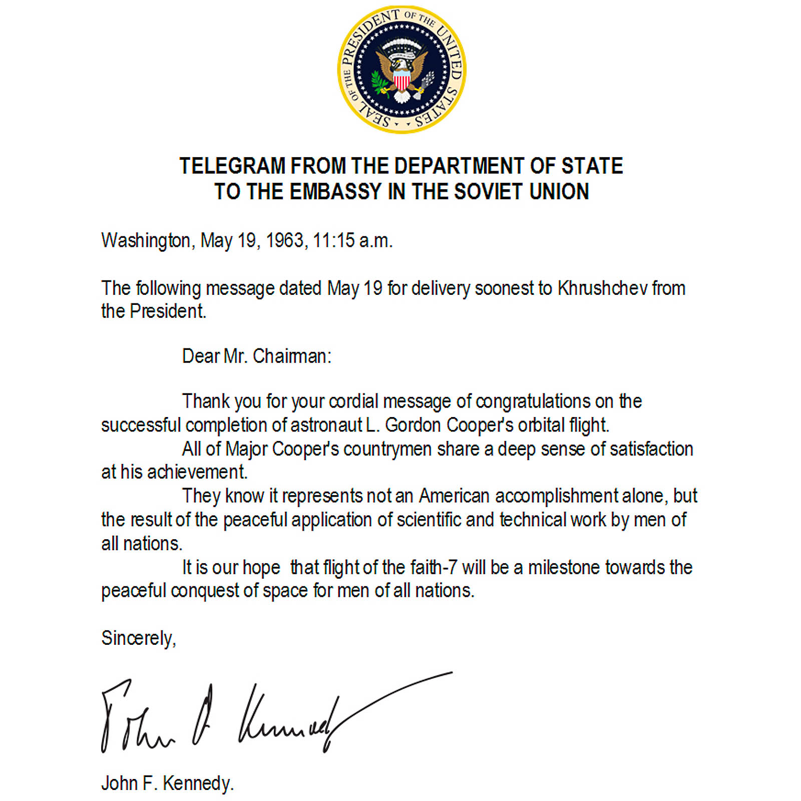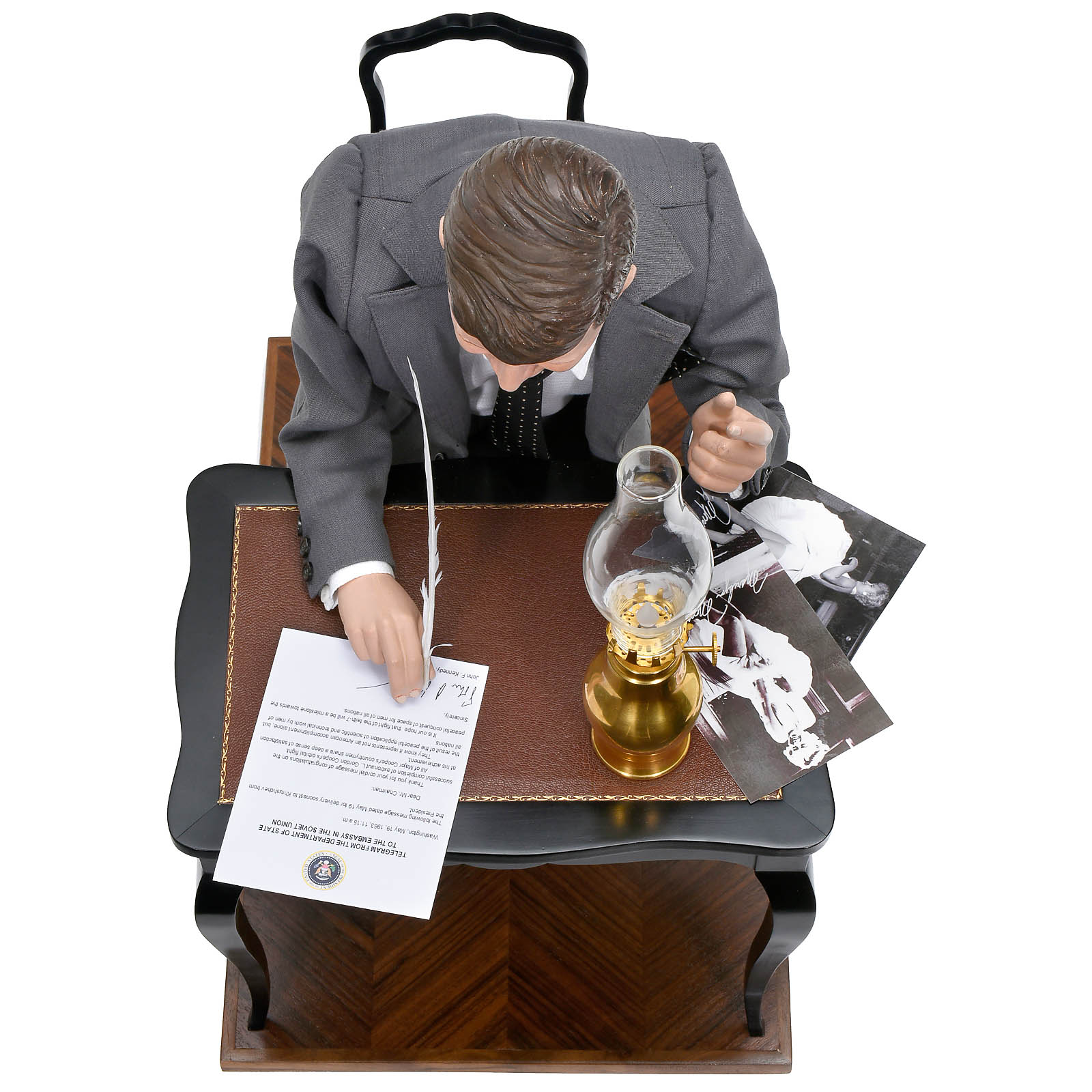Depicting President Kennedy at work at his desk, with plaster-composition character head, brown glass eyes and moulded hair, seated at ebonized writing desk with quill pen and a battery-powered brass lamp, dressed in grey wool suit, spotted tie and hand-sewn leather shoes, with single-air going-barrel movement in body playing "Happy Birthday" and brass key signed "C.B.", height 21 ½ in. (55 cm), base 12 in. (30 cm) x 17 ¾ in. (45 cm). – Inspired by Gustave Vichy's automaton "Pierrot Ecrivain" of c. 1895, Bailly portrays the 35th president of the United States engaged with official correspondence: a telegram to Soviet Premier Nikita Khrushchev. – The President's thoughts, however, appear to be on the photographs of Marilyn Monroe that lie on his table, for – as the lamp light dims – he pauses and his head falls, as though on the verge of sleep. Waking, he turns up the lamp and continues writing. – The automaton is accompanied by the theme "Happy Birthday", recalling Marilyn Monroe's unforgettable performance of "Happy Birthday, Mr. President" at Madison Square Garden, New York, on 19 May 1962 – just three weeks before her sudden death. – This contemporary automaton by Christian Bailly completes his political trilogy, after Presidents Barack Obama in 2013 and Vladimir Putin in 2014. – Literature: Bailly, "Automata, the Golden Age", pp. 74–75. – A unique animated portrait.