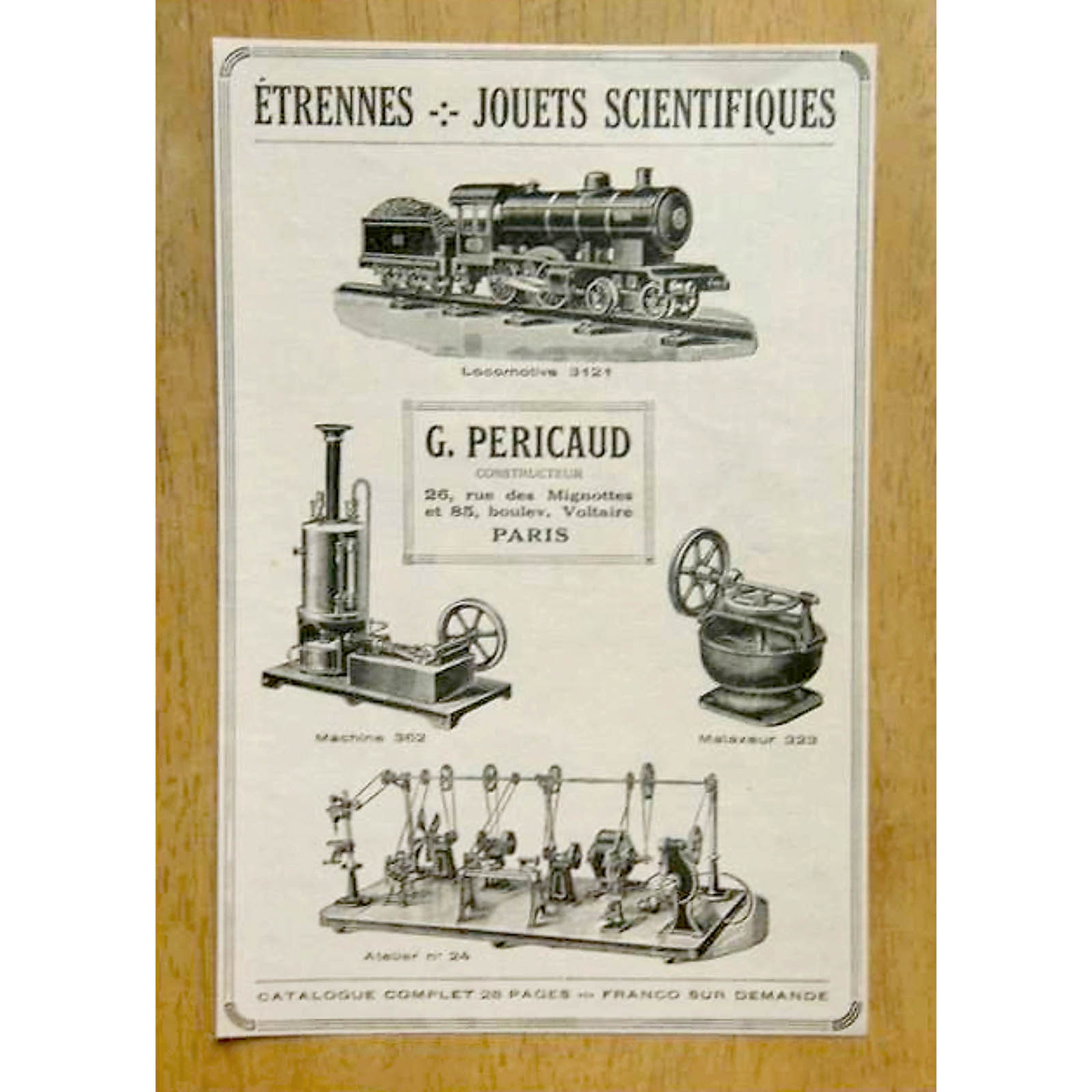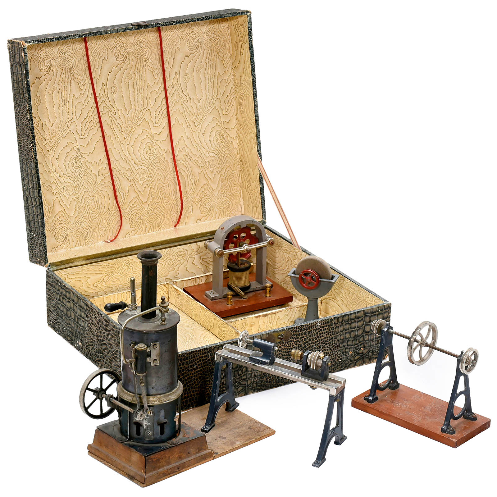 Péricaud, Paris; starter set consisting of: vertical steam engine (missing burner), transmission, grinder, lathe and dynamo, in reptile-look paper-covered case, air pressure tested, working.