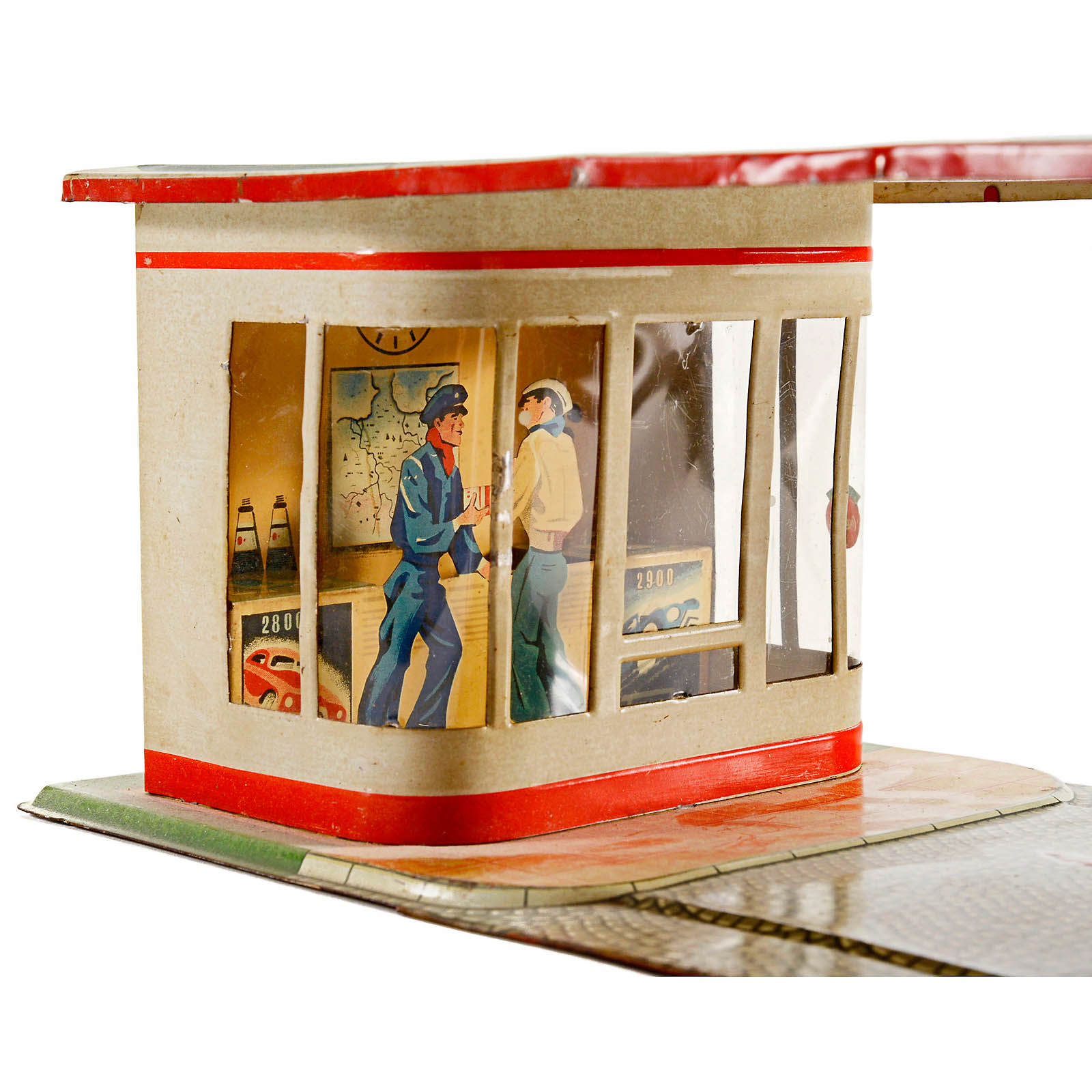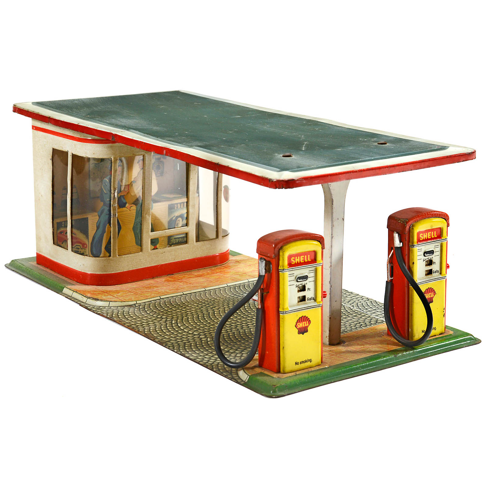 Lithographed tin, celluloid window pane, 2 petrol pumps with tubes, 13 1/3 x 7 x 5 in.