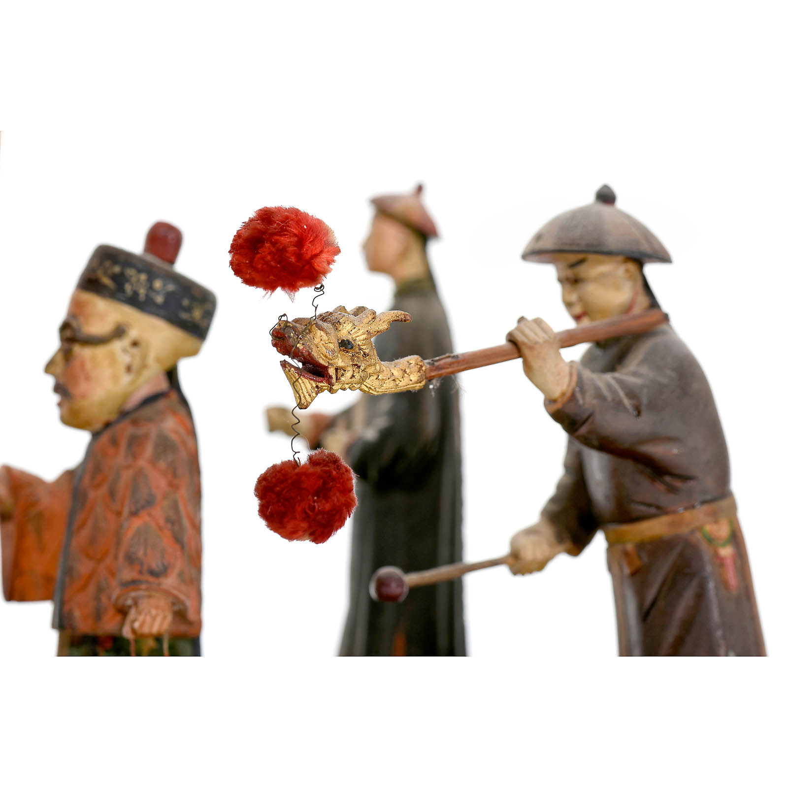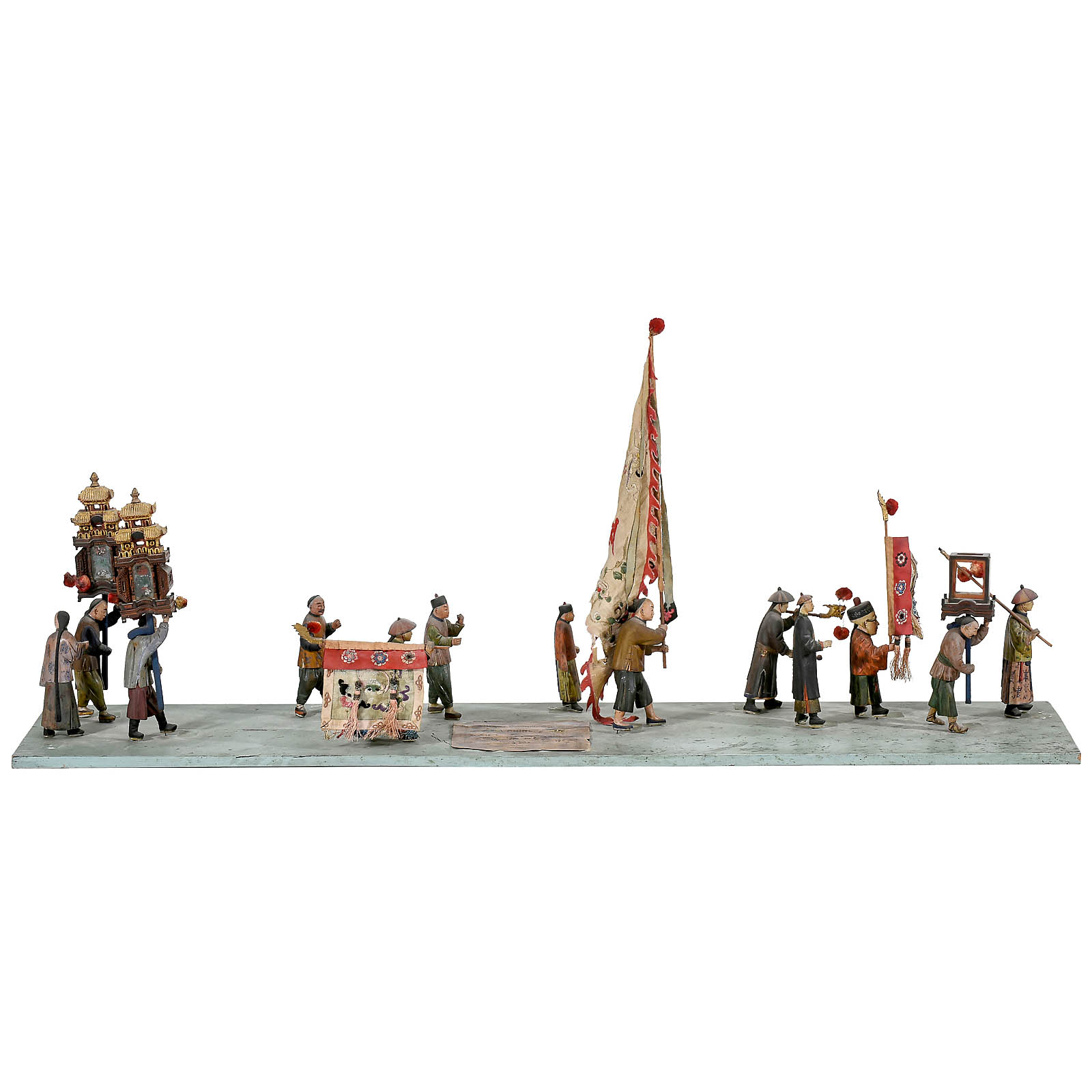 Depicting a procession of thirteen finely-carved and painted wood figures in Qing Dynasty costumes, including dragon-standard-bearers, two men carrying miniature temples, a masked man and flag-bearers, one with embroidered flag of the Eastern Han Dynasty general Guan Yu, on wood base with label: "Exposition Universelle de Paris, 1900. Groupe XII, Classe 71, Modele de 132 Figures …. Representant la Procession Annuelle de la Fête de Printemps, Exposant: Gouvernemente Chinois, Provenance: Ning-Po, No. 196", figures approx. 4 in. (10 cm) high, base 6 ¾ x 33 in. (17 x 84 cm), good overall condition, musicians missing instruments. The Exposition Universelle de Paris ran from 15 April till 12 November 1900 and attracted almost 50 million visitors. The figures were presumably the vanguard of a larger procession, made up of similar groups, exhibited by the Chinese government.