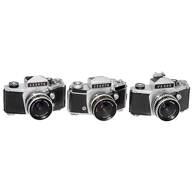 Ihagee, Dresden. 1) Exakta (VX 500), no. 1584895, version without "VX500" label, c. 1969, Tessar 2,8/50 mm, prismfinder. (3–2/2-) – 2) VX 500, no. 1512203, version 4, 1969, Tessar 2,8/50 mm, prismfinder. (3–2/2) – And: 3) VX IIb, no. 1038331, 1963, serial number at the top (inside), T 2,8/50 mm, prismfinder, excellent condition! (2/2)