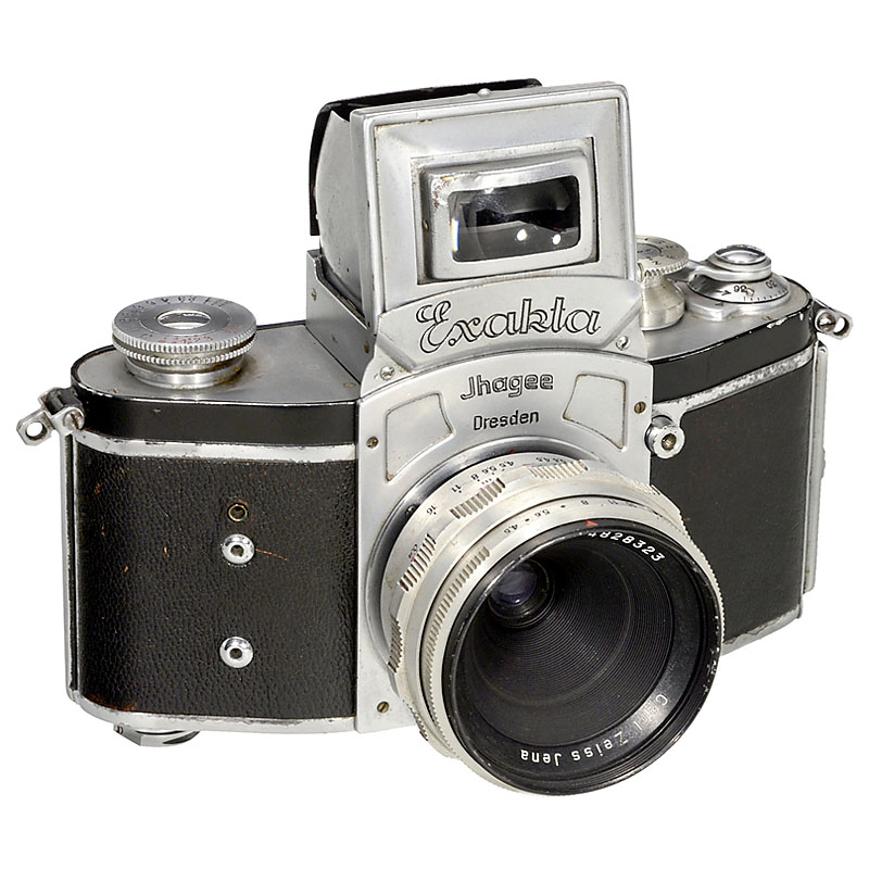 Ihagee, Dresden. No. 595480, 3rd version, Tessar 4,5/40 mm, no. 4828323, mini dent on waist-level viewfinder. With extension tube and instruction manual for Exakta Varex.