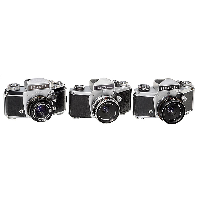 Ihagee, Dresden. 1) Varex IIb, no. 1007427, 1963, Schneider Xenon 1,9/50 mm, prismfinder. (2/2) – 2) Exakta VX 500, no. 1502185, version 2.1, Tessar 2,8/50 mm, prismfinder. (2/2-) – And: 3) Elbaflex VX 1000, no. 1184240, version 3, 1968, Tessar 2,8/50 mm, prismfinder, long shutter speeds uneven. (2/3-)