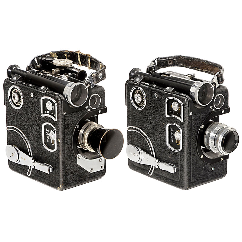 Siemens, Berlin. 16 mm movie camera for 12 m film in Siemens cassette. C-mount lens Xenon 1,9/16 mm. With original rangefinder by Leitz, Wetzlar (very rare), clockwork drive 8–64 p/s. – Body no. 40719, pre-war. – In addition: Special demo cassette (transp