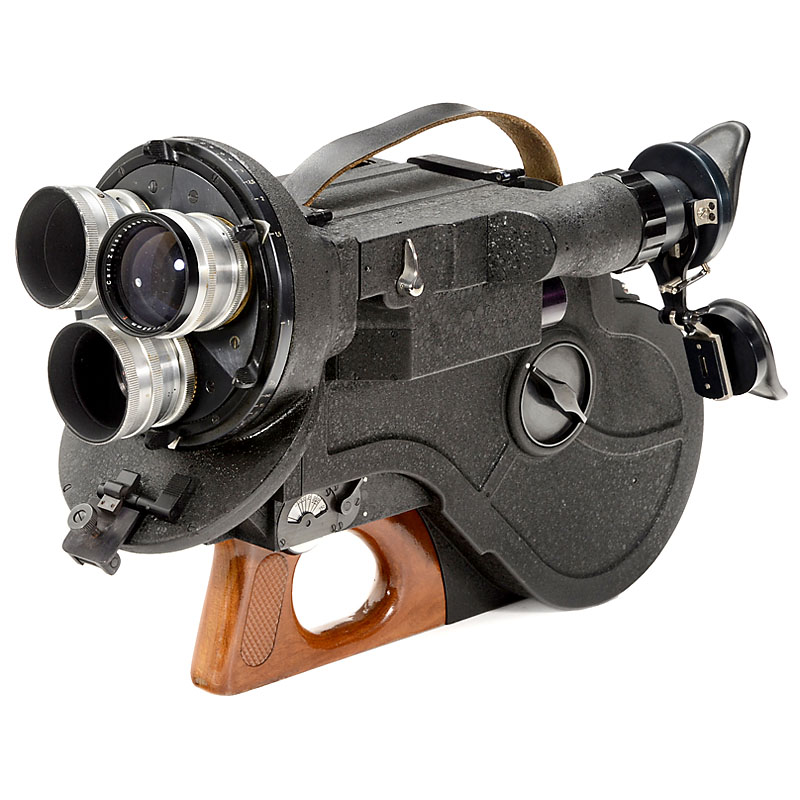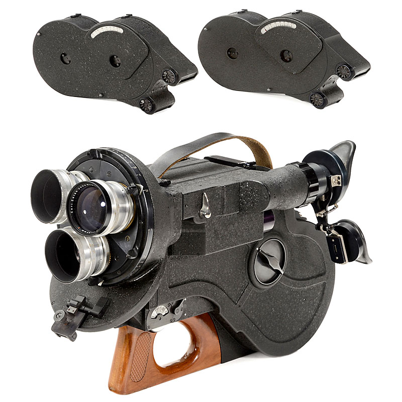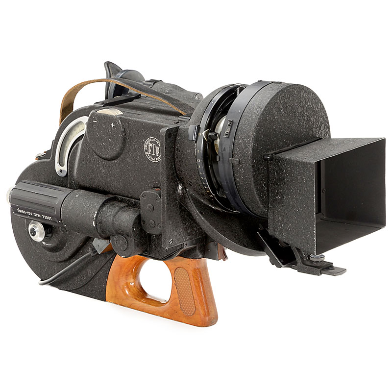 Cinephon, Prague. 35 mm movie camera for shoulder and tripod handling, cassette for 60 m film (inside). Lens revolver head with 3 lenses: Zeiss Jena Biotar 2/35 mm, Sonnar 2/50 mm and Sonnar 2/85 mm, electric drive (electric functions not tested). With or