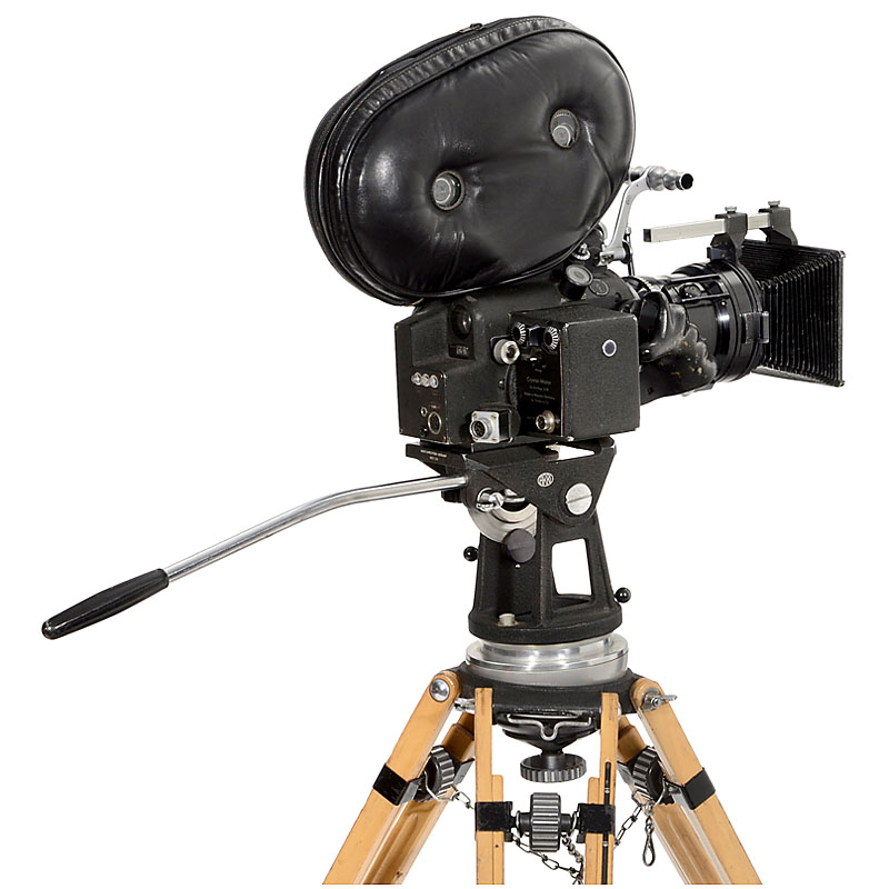 Arnold & Richter, Munich. Low-noise 16mm camera, with cassette for 120 m film, electric drive, lens: Vario-Sonnar 2,8/10–100 mm. Right-angle finder for shoulder handling. With original Arri II C tripod and accessories. Electric functions not tested.