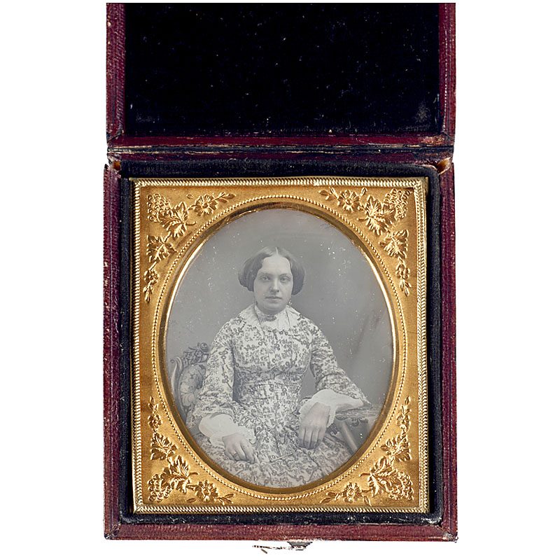 Presumably England or America. 1/6 plate, portrait of a lady, colored, excellent illumination and condition, brass passe-partout with floral ornaments, in case.