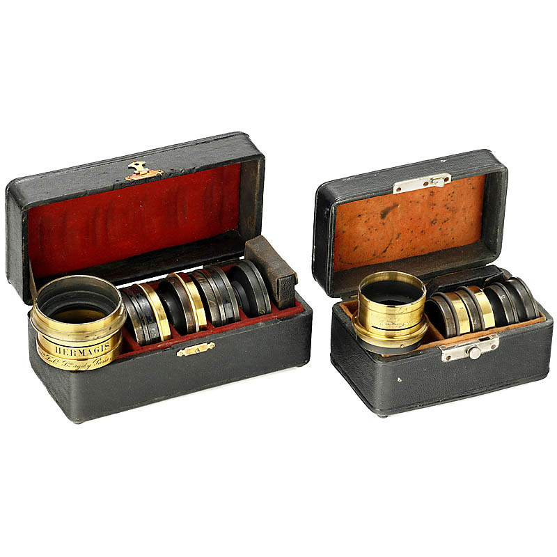 1,Hermagis,巴黎,Hermagis镜头全套,共有四件,Grand Angle No.7,安琴No.7,2个安琴No.6,插入式光圈,原装皮革箱