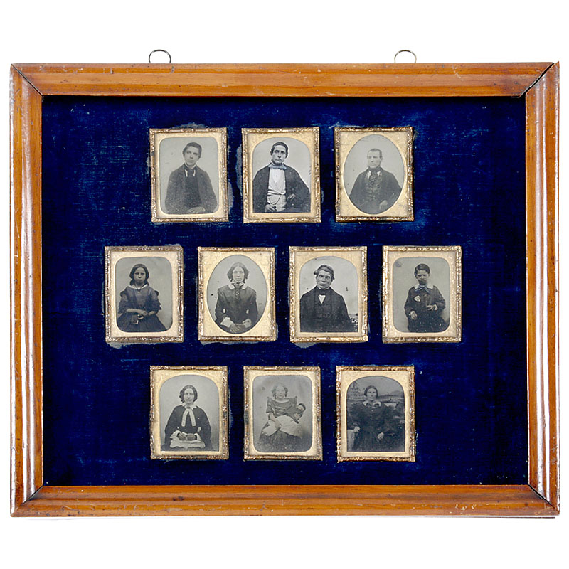 Frame with 10 ambrotypes (5 x 6 cm), partly hand-colored, with brass and copper passe-partout. Wooden frame 12 x 14 1/5 in.