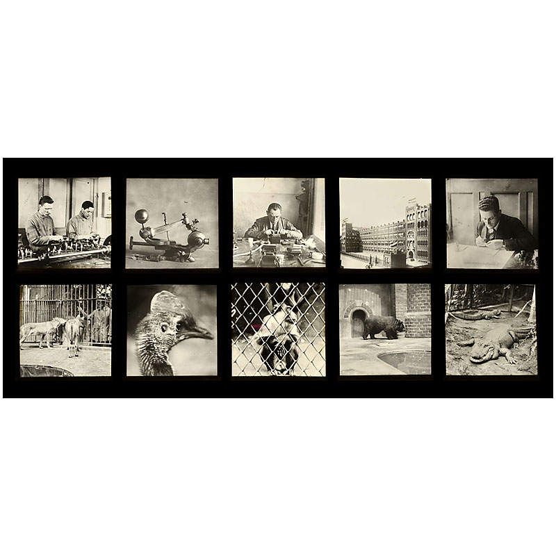 Motifs from all over the world, approx. 180 slides in black and white. 5 boxes "Projektion für alle" and 8 boxes from the Netherlands: "Europeesche Reizen" and "De Amsterd. Diergaarde".