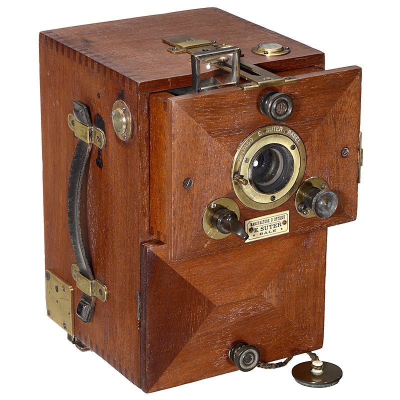 Suter, Basel. "Suter's Hand Camera", tropical wood with brass fittings, body no. 1114, very early version with folding optical finder, Model A, for 20 plates size 9 x 12 cm, E. Suter 1/12 lens, No. 17450, original lens cap, rotary shutter (working), cassettes inside. Excellent condition!
