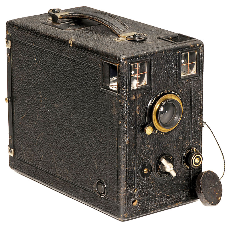 Photo-Docks, Avenue de la République, Paris. Detective camera, size 9 x 12 cm, with 12 cassettes, lens: Symetrique-Extra-Rapide, guillotine shutter (working). – Rare magazine camera!