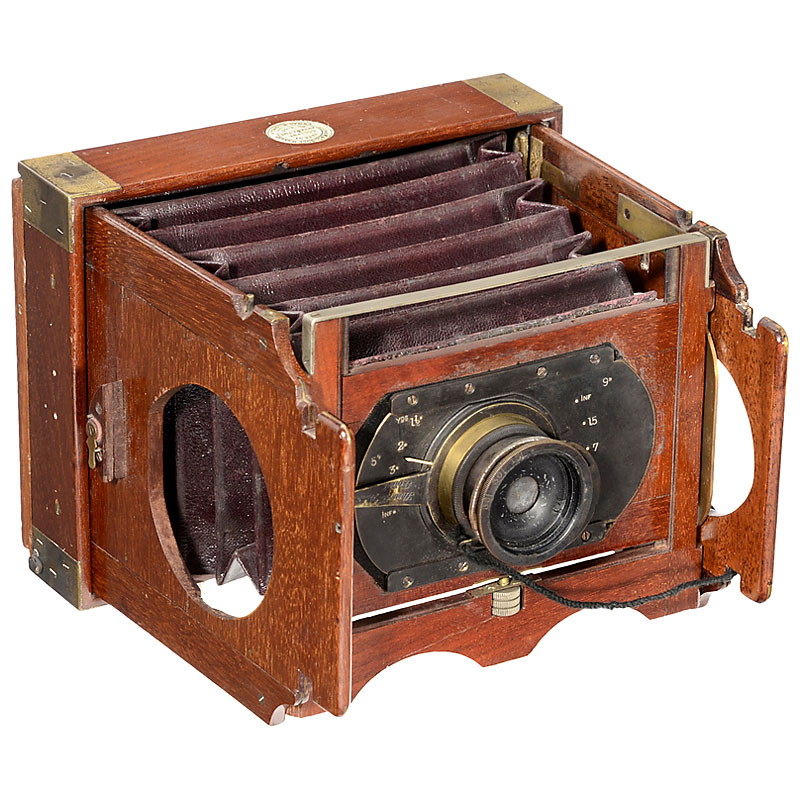 J. F. Shew & Co., London. Plate size 4 ¼ x 6 ½ in., polished wood with brass fittings, dark-red bellows, with original lens by J. F. Shew (rotating shutter), focusing screen back.