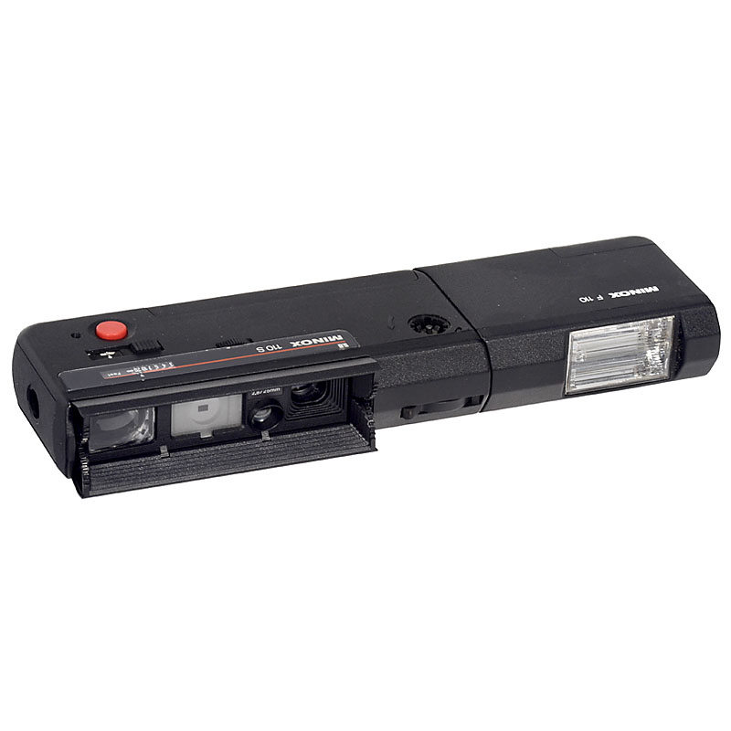 Minox, Gießen. 1) Minox C, no. 2340002, size 8 x 11 mm, with tripod holder. – And: 2) Minox 110 S, no. 4507038, for pocket film type 110, with flash F 110 and camera case.