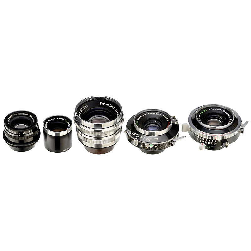 Schneider-Kreuznach. 1) Xenotar 3,5/75 mm, without shutter. (1-/1-) – 2) Symmar 5,6/100 mm (12/175 mm) in Linhof-Compur (1/500 sec.). (2+/2-) – 3) Symmar 5,6/105 mm (12/185 mm) in Linhof-Synchro-Compur. (3–2/2). – 4) Symmar 5,6/135 mm, without shutter. (3/3) – And: 5) Symmar 6,8/135 mm (12/210 mm + 13/260 mm), without shutter, presumably a prototype! (1-/1)