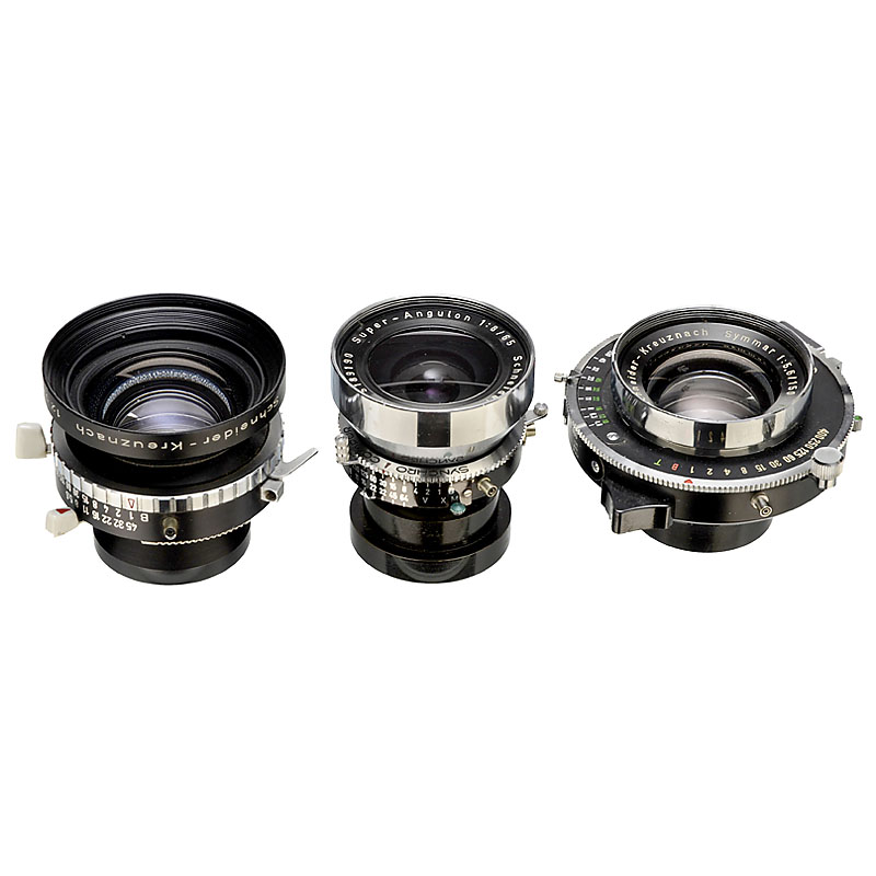 Schneider-Kreuznach. 1) Super-Angulon 8/65 mm in Synchro-Compur, shutter working unevenly. (2–3/3-) – 2) Symmar 5,6/150 mm (12/265 mm) in Copal-No. 1. (3/4) – And: 3) Symmar-S 5,6/150 mm in Synchro-Compur. (2-/1-)
