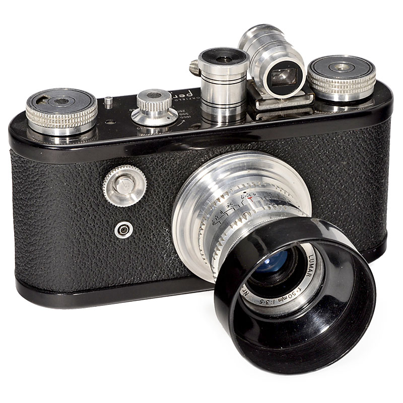 Corfield, England. Body no. 3290, early verion with speeds on top, Lumar 3,5/50 mm (M39). Attractive SLR camera with periscope finder and accessory viewfinder, focal plane shutter 1/30–1/1.000 sec. Mint condition! With case.