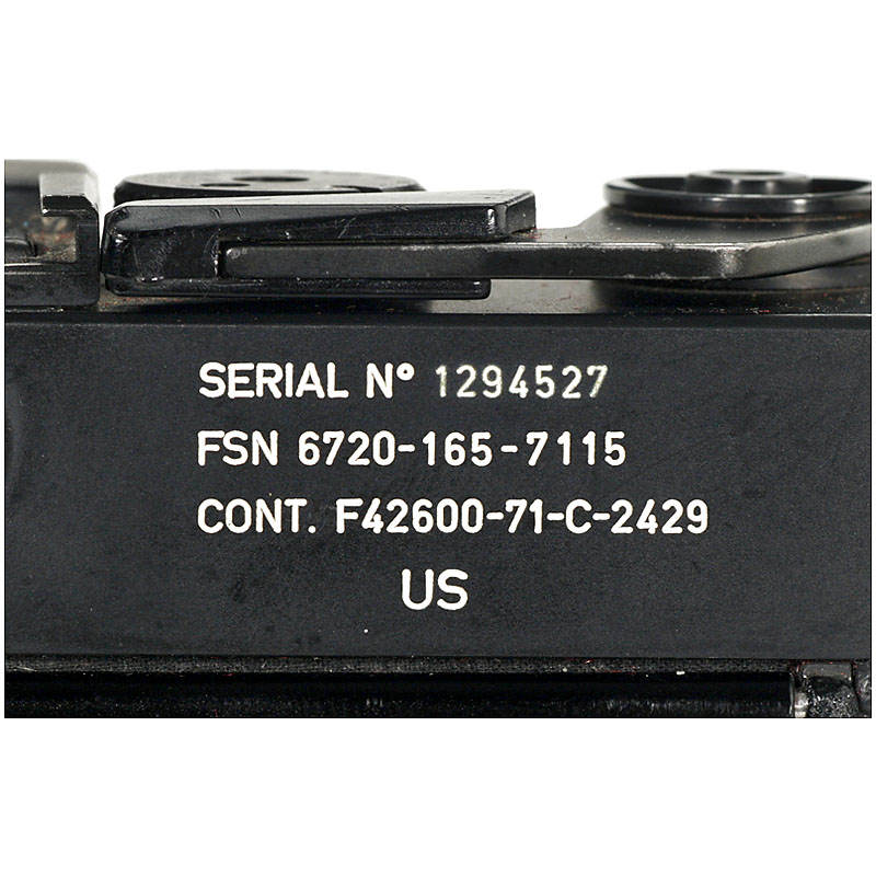 Leitz, Midland, Canada. Serial no. 1294527. "Contract" no. F 42600-71-C-2429, FSN 6720-165-7115. Very rare black M4, produced for the U.S. Army in mini-series only! With Elcan 2/50 mm, no. 276-0093, lens hood C42-LS39F (stuck on lens) and original case with military engraving. – Giant Rarity!