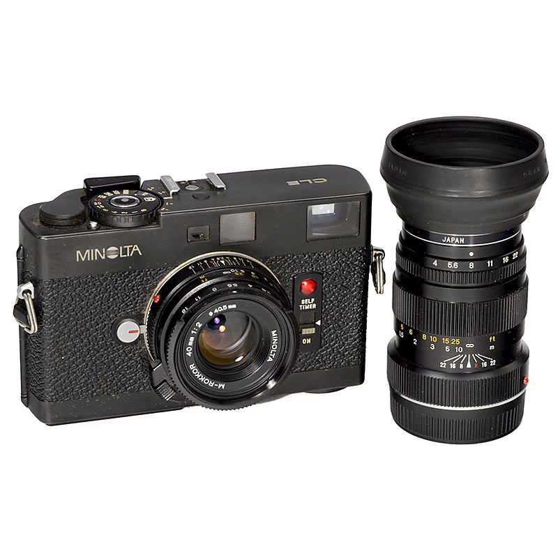 Minolta, Japan. 1) Minolta CLE, 1981, no. 1005226, the advanced Leica CL with TTL-controlled focal plane shutter. With M-Rokkor 2/40 mm. (3/2-) – And: 2) M-Rokkor 4/90 mm, lens hood and 2 caps. (3/2)