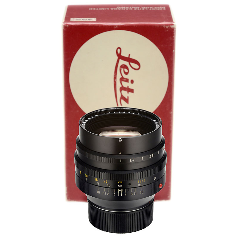 Leitz, Canada. No. 2750596 (!), 1st version for 58mm filter. Optics, focusing mechanism and paint in excellent condition. With 2 caps and original box. Early Noctilux from the 1st production year. – Like new!